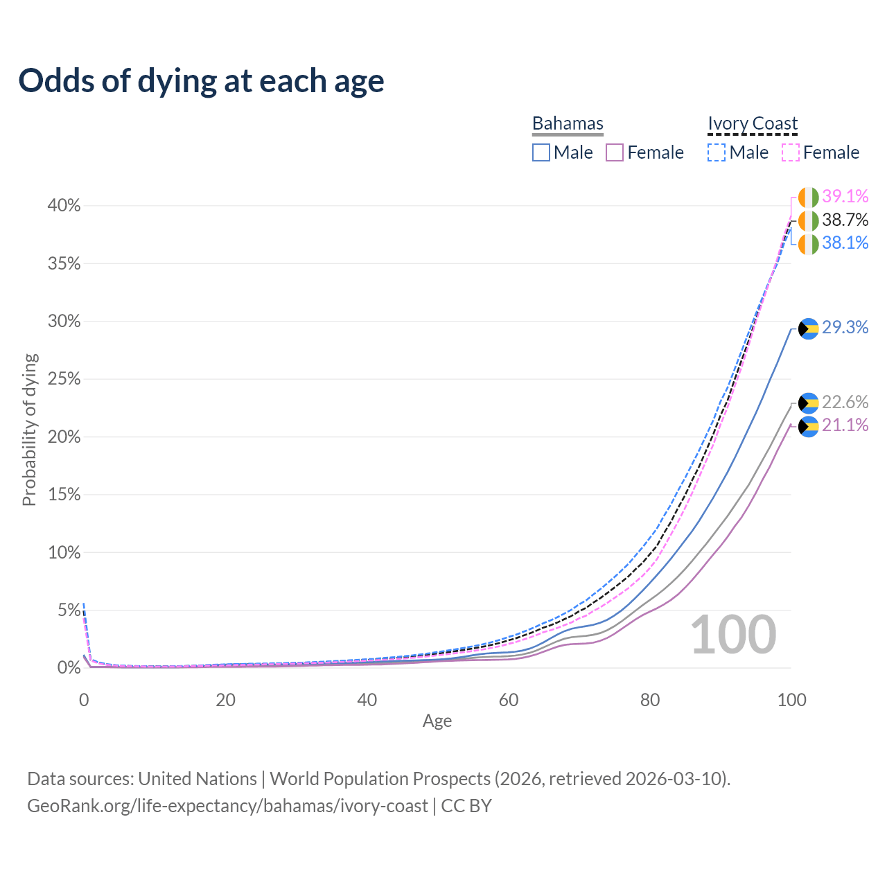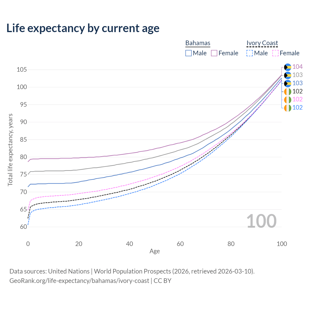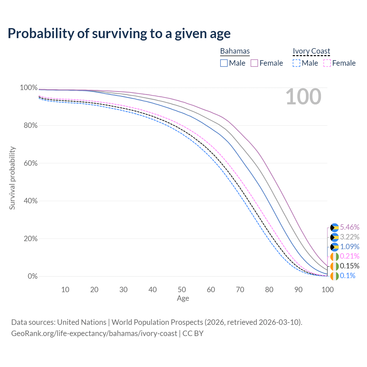 This life expectancy calculator shows the odds of living to 100, 95, 90, and below based on current age for both males and females in the Bahamas and Ivory Coast, along with mean and median age of death. The calculations are based on the 2026 life tables (actuarial tables) from the UN World Population Prospects.