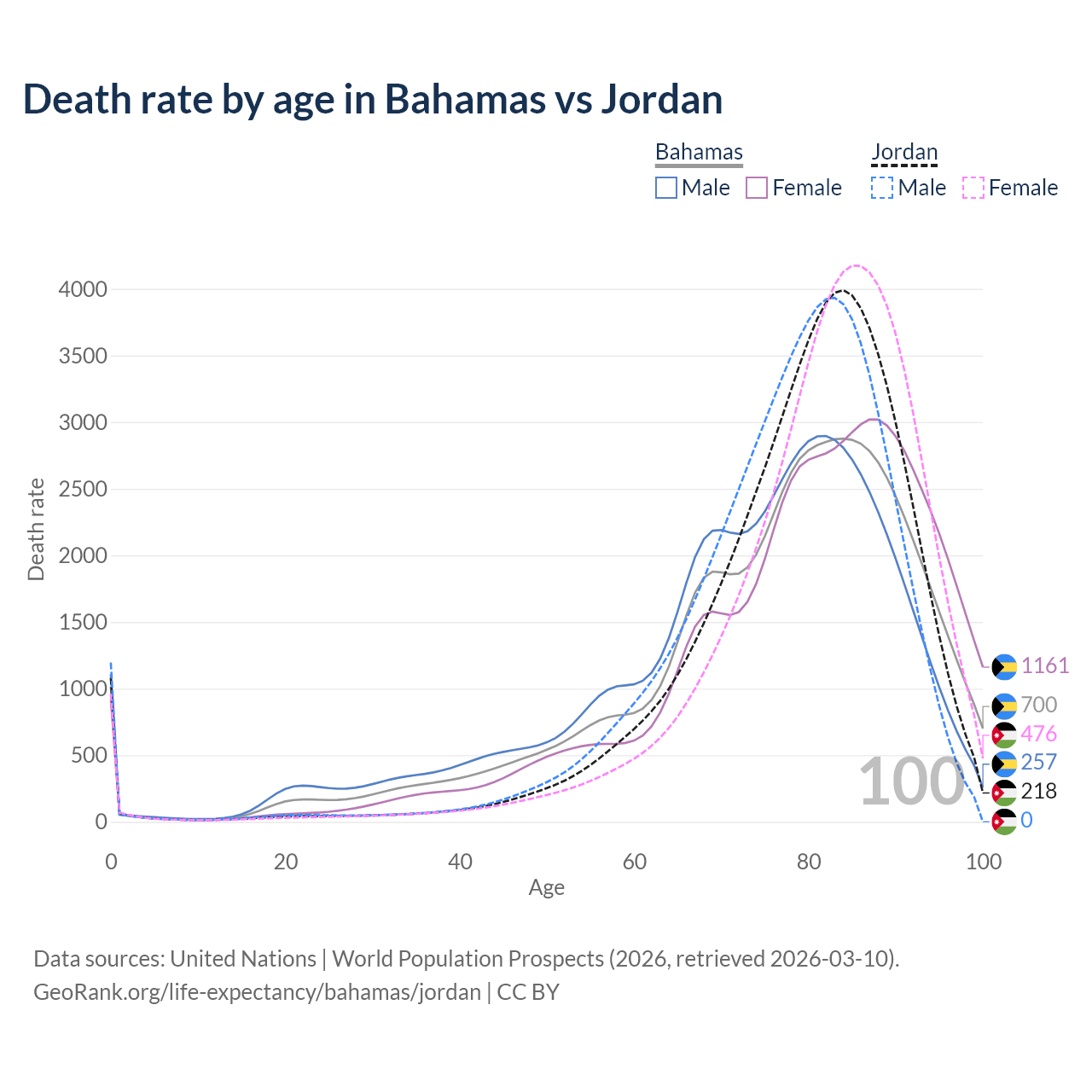 In the Bahamas, the most common age of death is 84, compared to 84 in Jordan. The median age of death is 79.2 in the Bahamas and 81.3 in Jordan, meaning only half of each cohort is expected to live past that age.