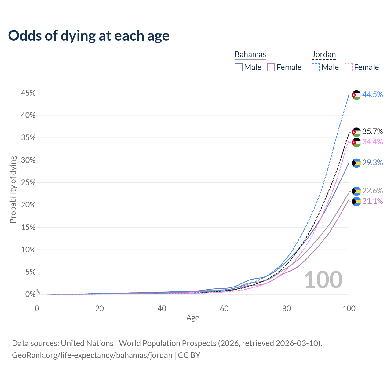 This life expectancy calculator shows the odds of living to 100, 95, 90, and below based on current age for both males and females in the Bahamas and Jordan, along with mean and median age of death. The calculations are based on the 2026 life tables (actuarial tables) from the UN World Population Prospects.