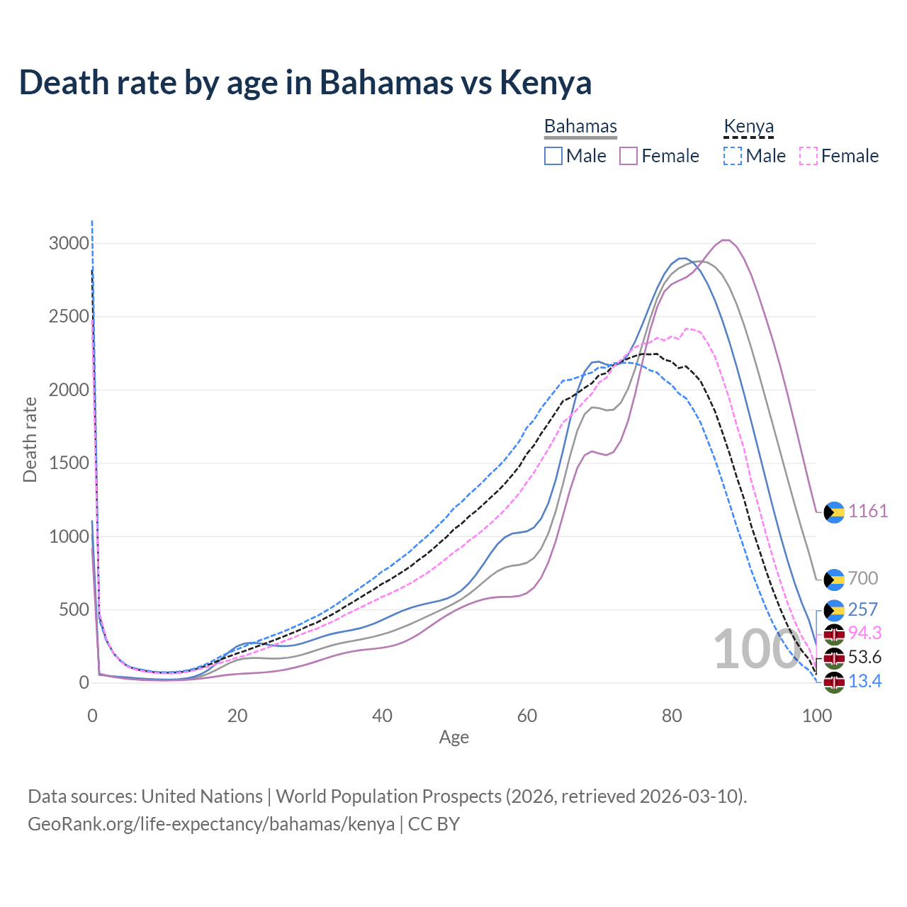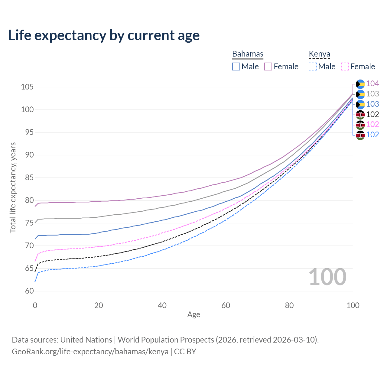 This life expectancy calculator shows the odds of living to 100, 95, 90, and below based on current age for both males and females in the Bahamas and Kenya, along with mean and median age of death. The calculations are based on the 2026 life tables (actuarial tables) from the UN World Population Prospects.