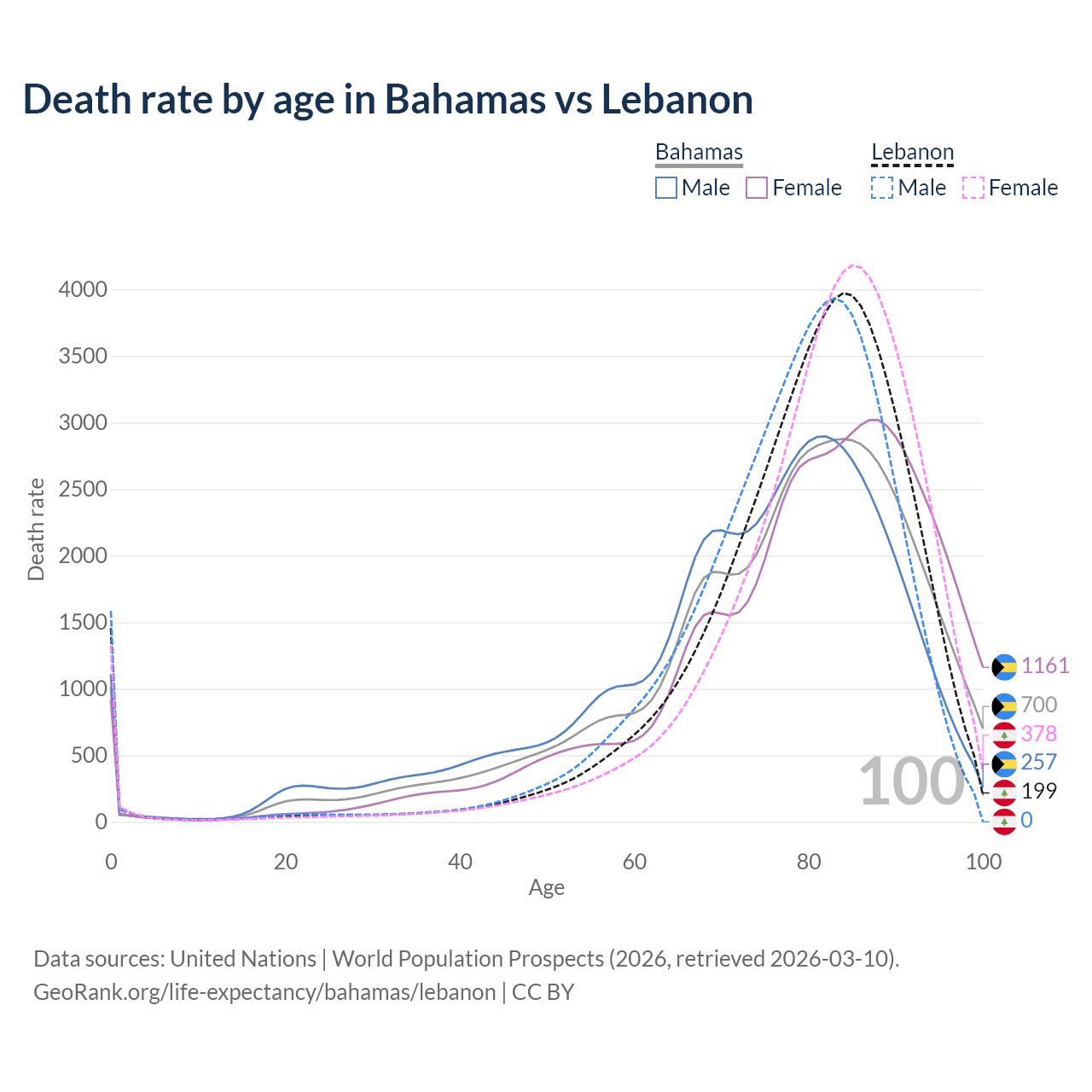 In the Bahamas, the most common age of death is 84, compared to 84 in Lebanon. The median age of death is 79.2 in the Bahamas and 81.6 in Lebanon, meaning only half of each cohort is expected to live past that age.