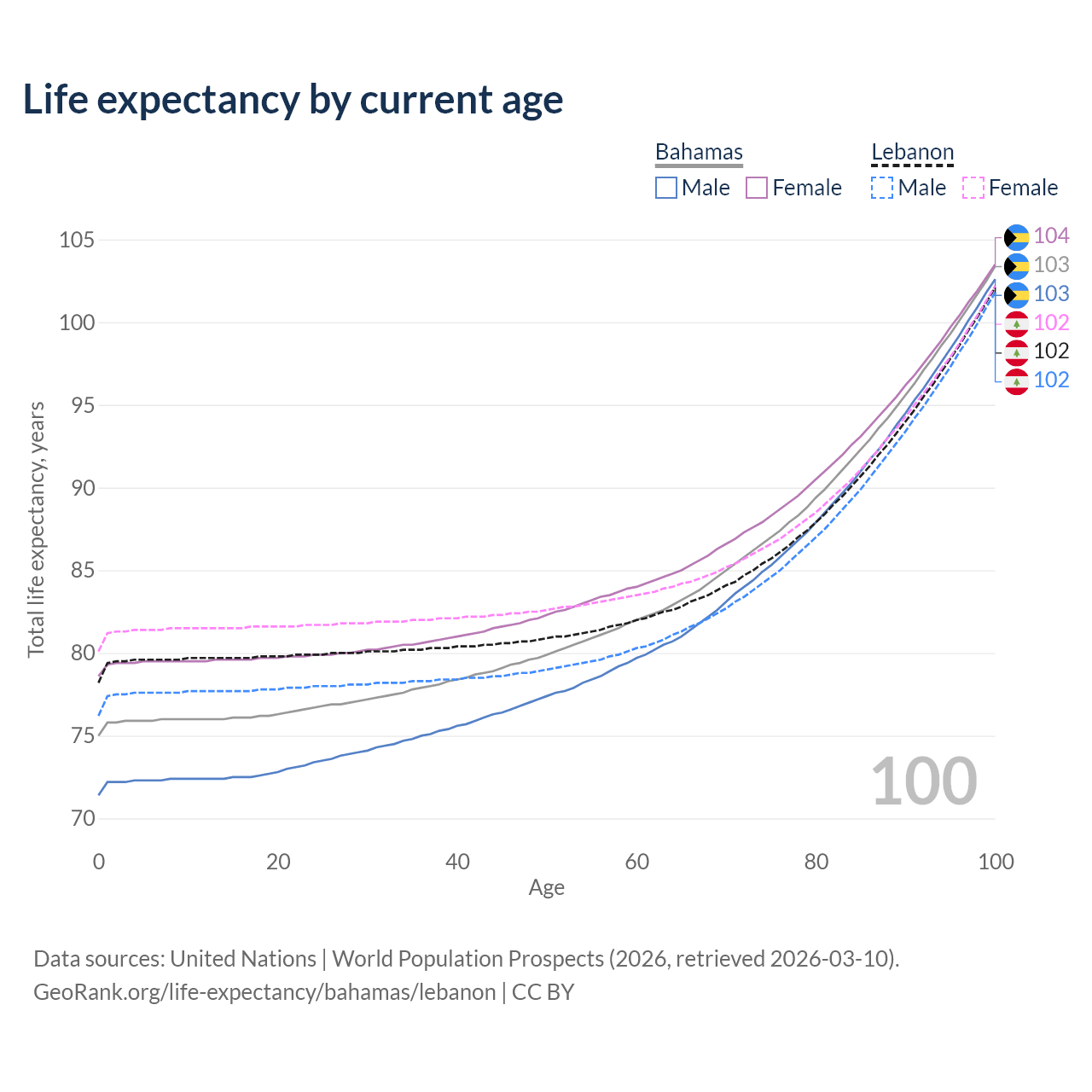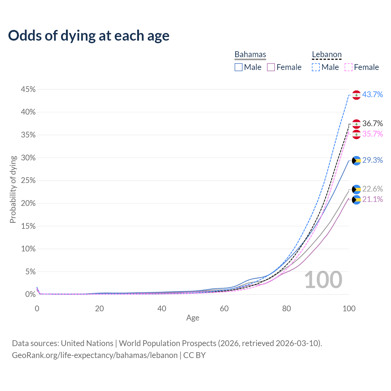 This life expectancy calculator shows the odds of living to 100, 95, 90, and below based on current age for both males and females in the Bahamas and Lebanon, along with mean and median age of death. The calculations are based on the 2026 life tables (actuarial tables) from the UN World Population Prospects.