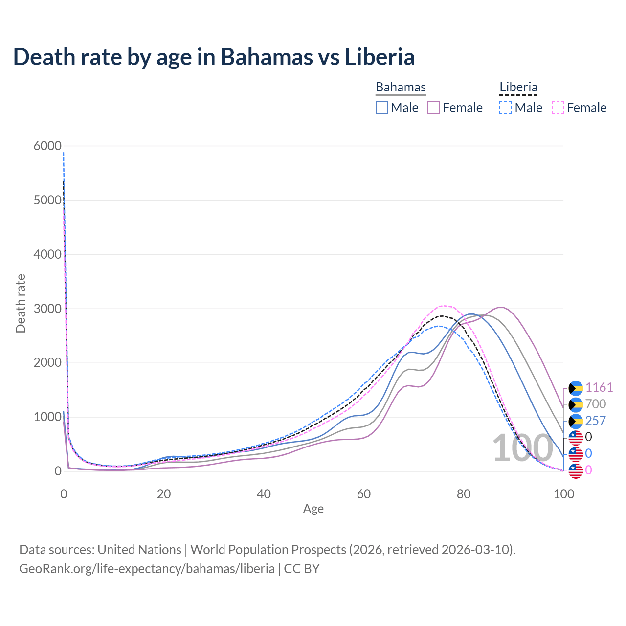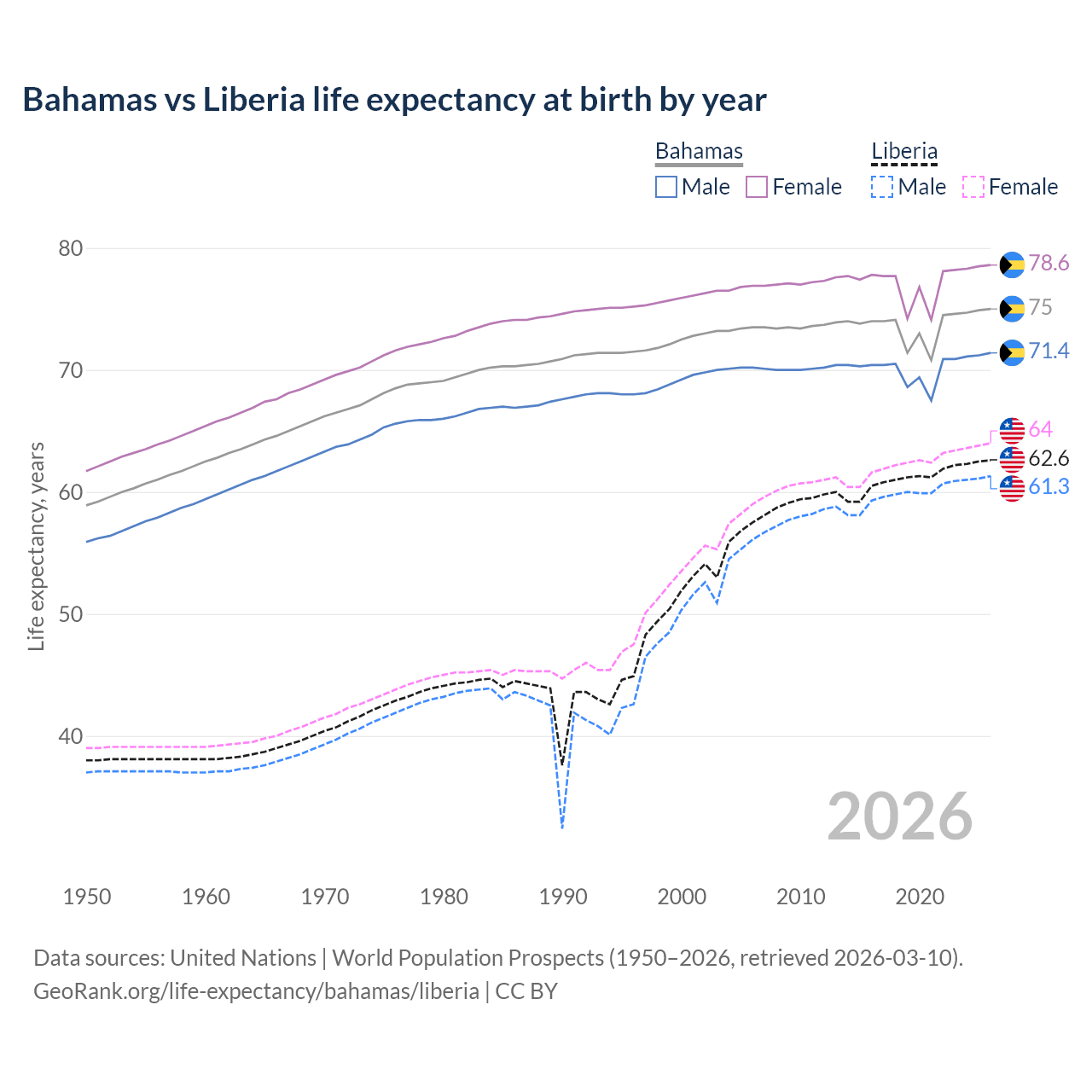 The average life expectancy at birth is 75 years in the Bahamas vs 62.6 in Liberia. The Bahamas is ranked 95/197 by life expectancy, and Liberia is 182/197. In the Bahamas, the life expectancy is 71.4 years for males and 78.6 years for females. In Liberia, it's 61.3 years for males and 64 years for females.