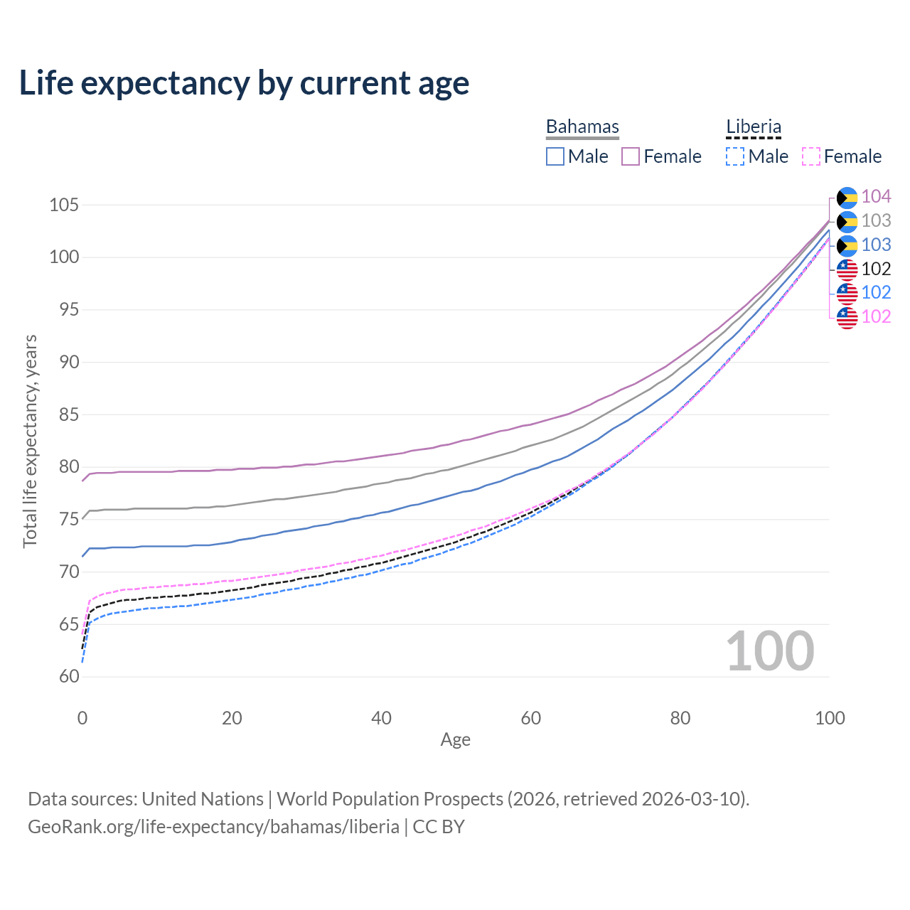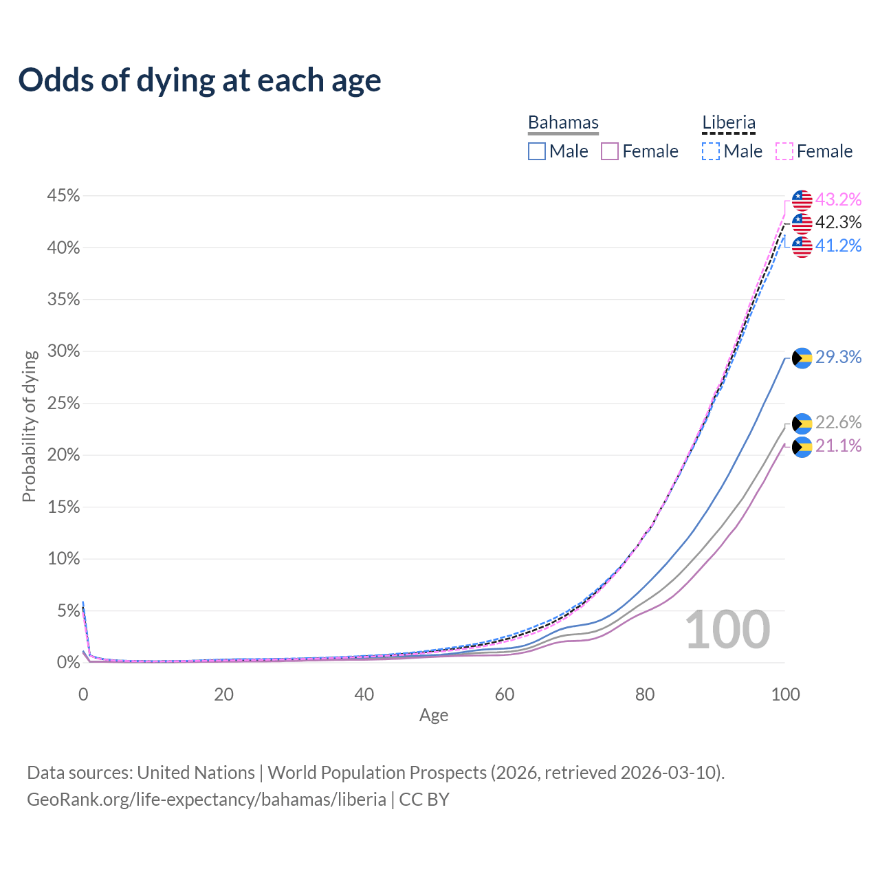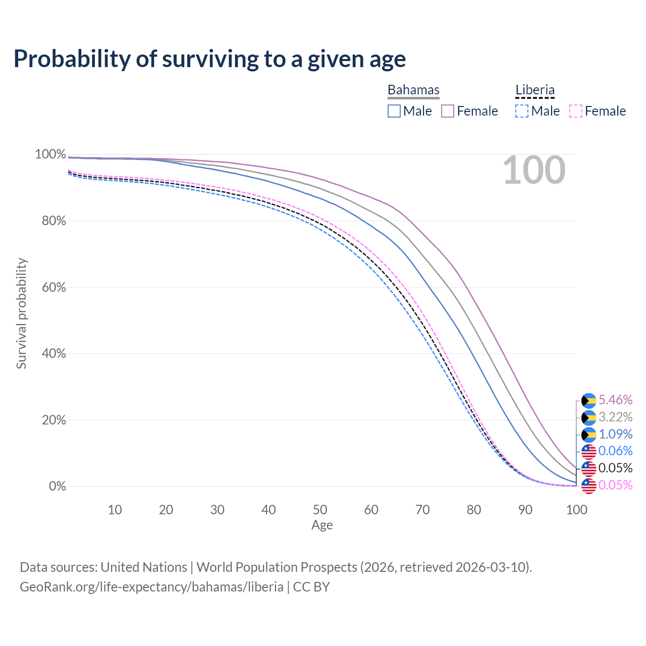 This life expectancy calculator shows the odds of living to 100, 95, 90, and below based on current age for both males and females in the Bahamas and Liberia, along with mean and median age of death. The calculations are based on the 2026 life tables (actuarial tables) from the UN World Population Prospects.