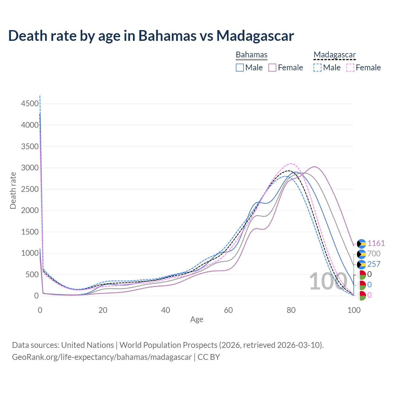 In the Bahamas, the most common age of death is 84, compared to 0 in Madagascar. The median age of death is 79.2 in the Bahamas and 72.2 in Madagascar, meaning only half of each cohort is expected to live past that age.