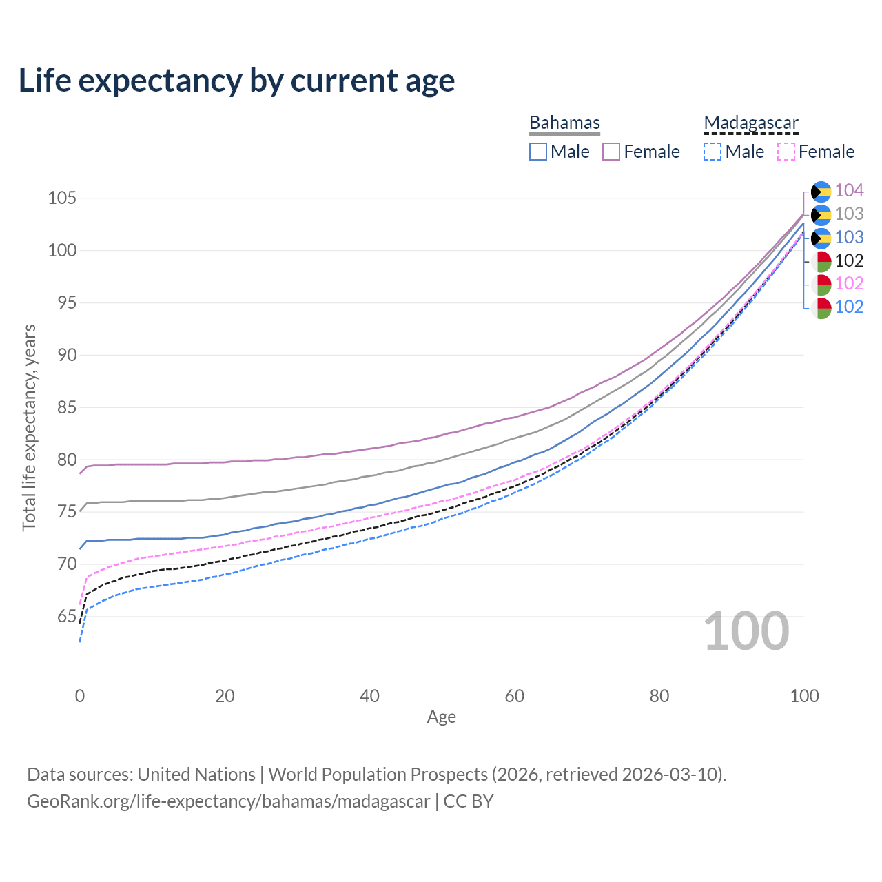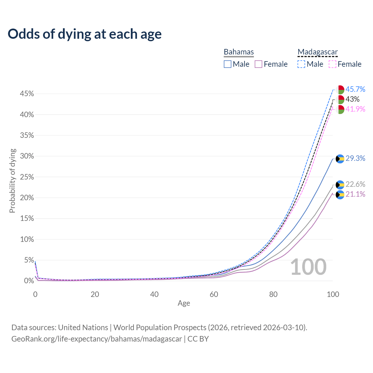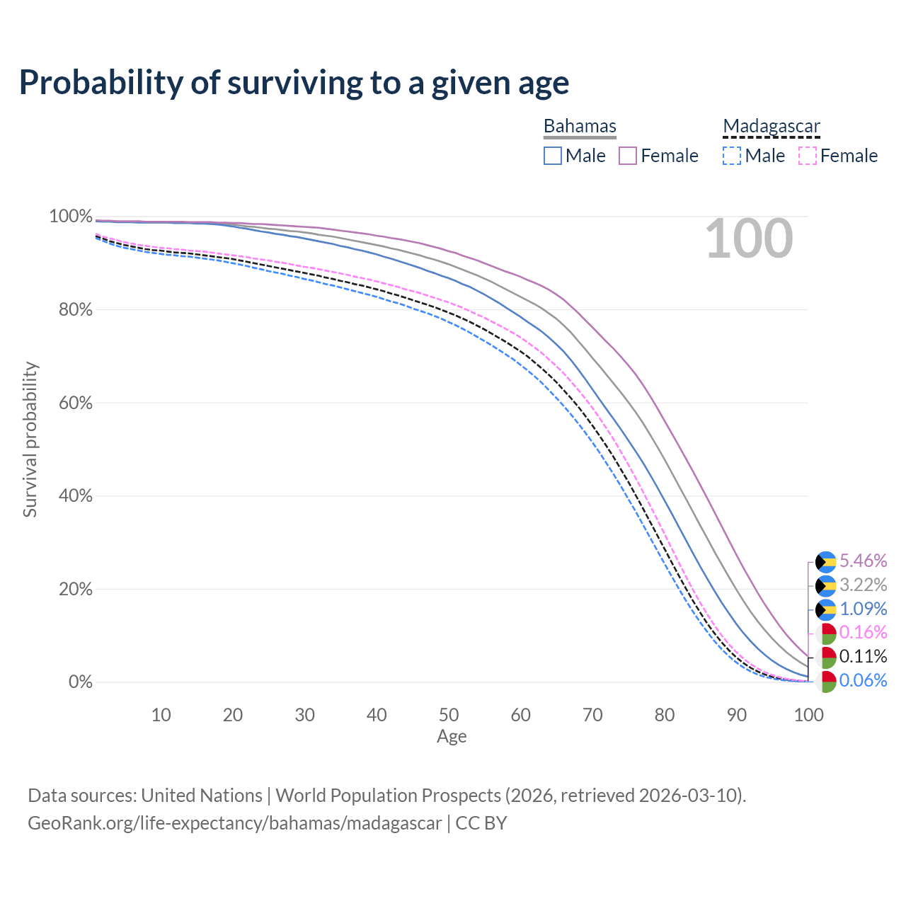 This life expectancy calculator shows the odds of living to 100, 95, 90, and below based on current age for both males and females in the Bahamas and Madagascar, along with mean and median age of death. The calculations are based on the 2026 life tables (actuarial tables) from the UN World Population Prospects.