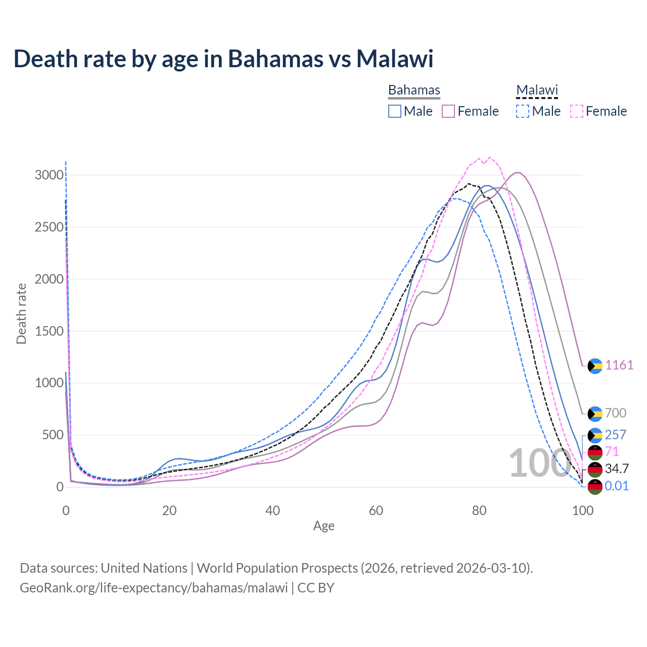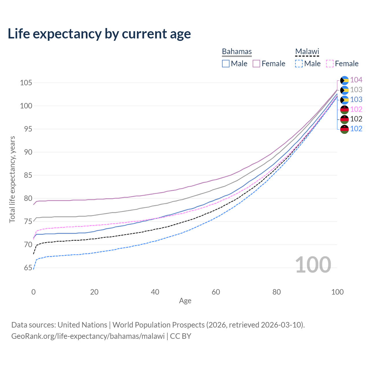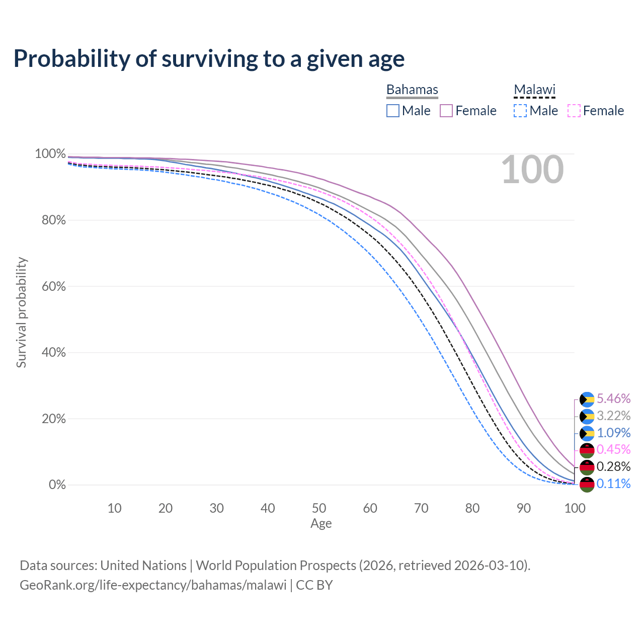 This life expectancy calculator shows the odds of living to 100, 95, 90, and below based on current age for both males and females in the Bahamas and Malawi, along with mean and median age of death. The calculations are based on the 2026 life tables (actuarial tables) from the UN World Population Prospects.