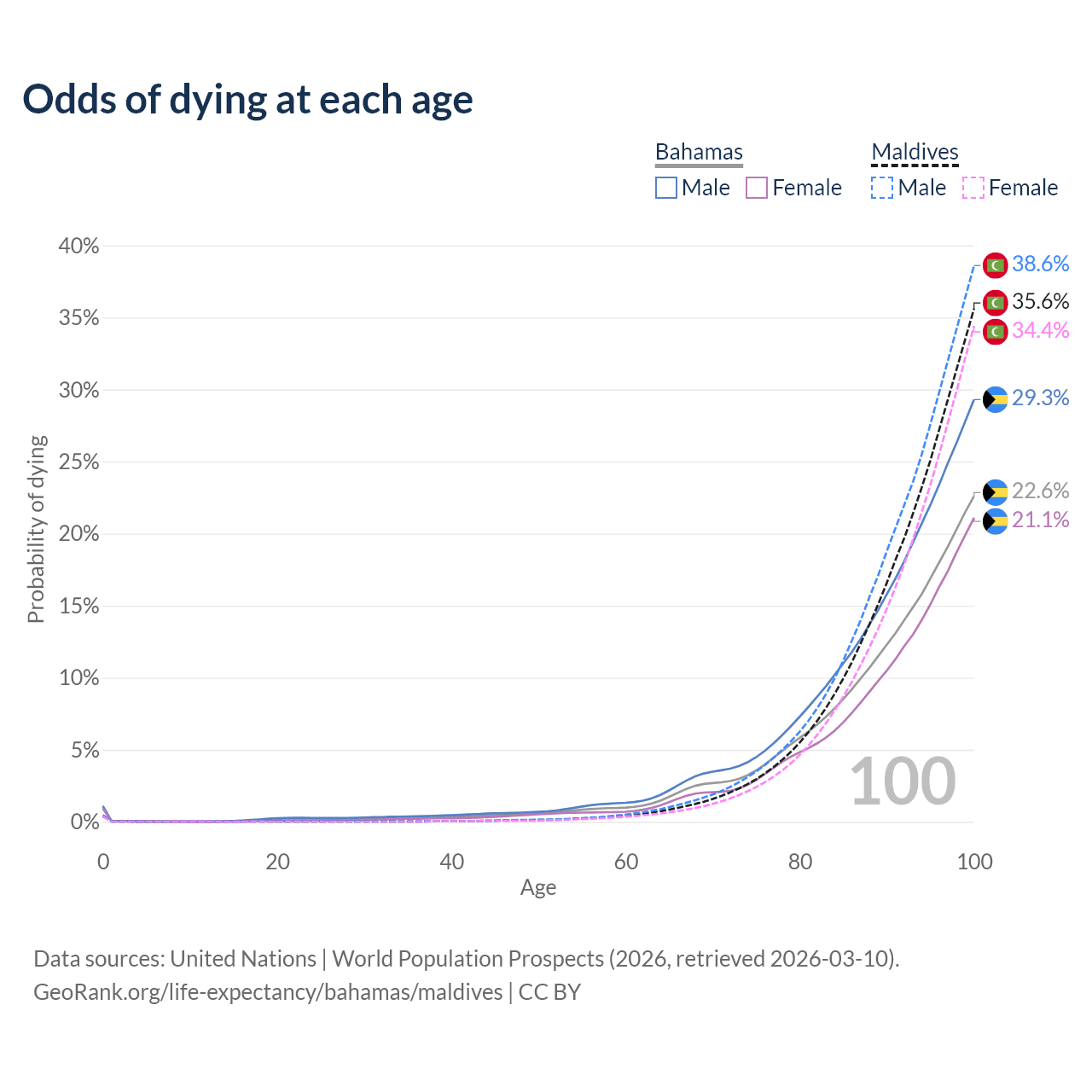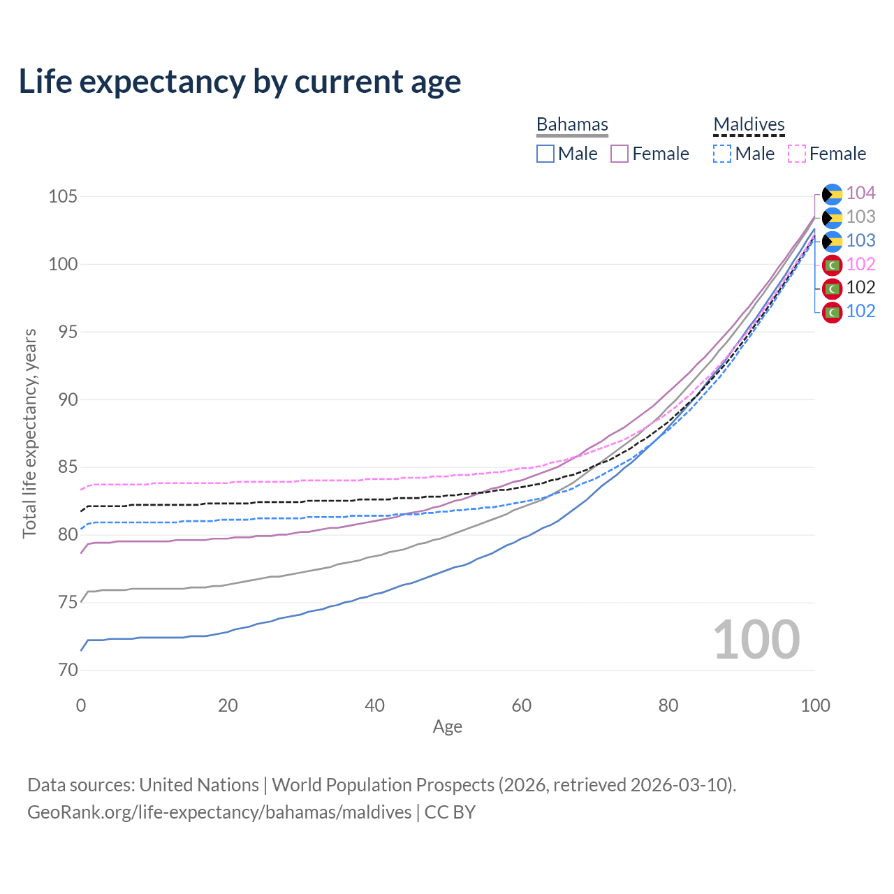 This life expectancy calculator shows the odds of living to 100, 95, 90, and below based on current age for both males and females in the Bahamas and Maldives, along with mean and median age of death. The calculations are based on the 2026 life tables (actuarial tables) from the UN World Population Prospects.