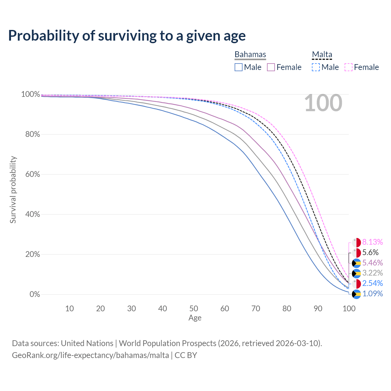 This life expectancy calculator shows the odds of living to 100, 95, 90, and below based on current age for both males and females in the Bahamas and Malta, along with mean and median age of death. The calculations are based on the 2026 life tables (actuarial tables) from the UN World Population Prospects.