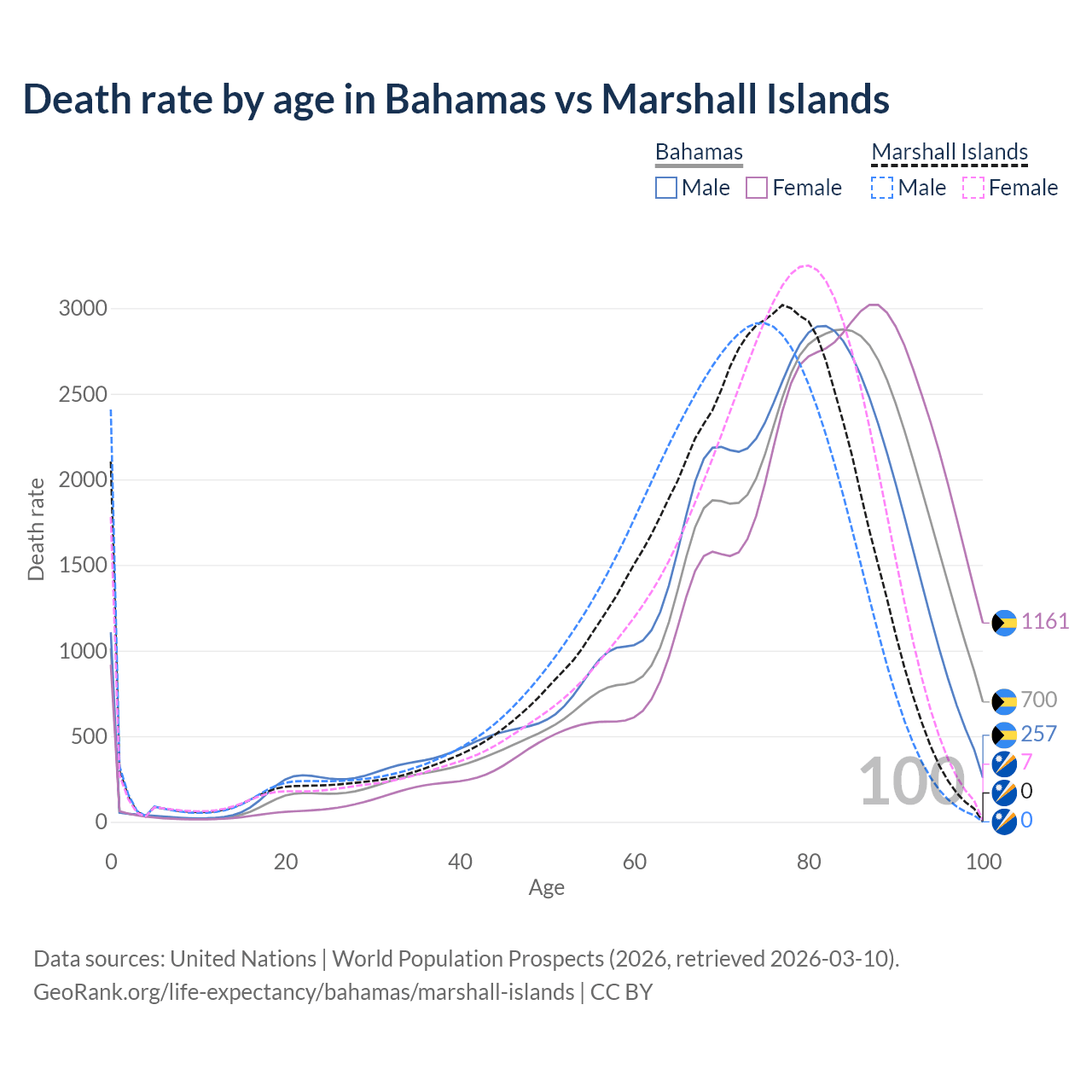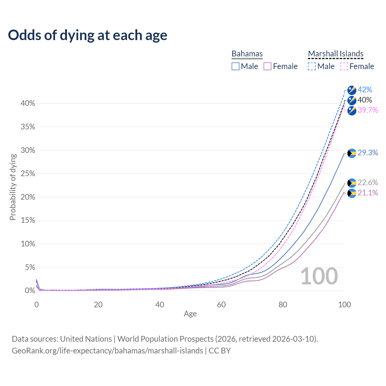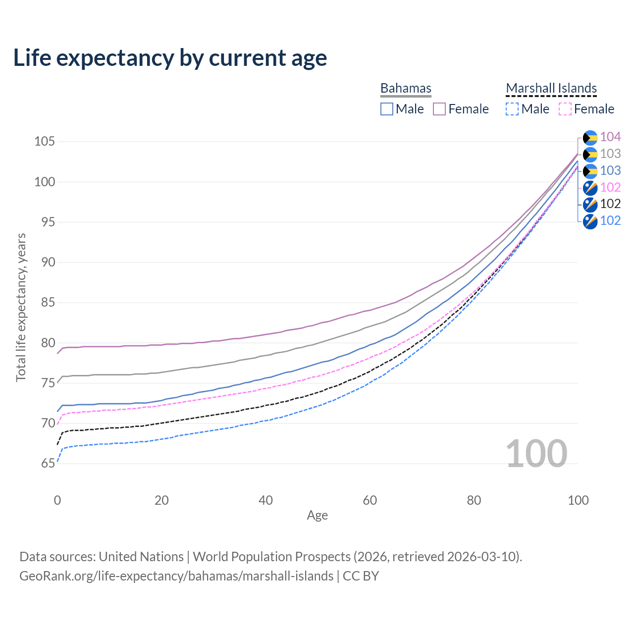 This life expectancy calculator shows the odds of living to 100, 95, 90, and below based on current age for both males and females in the Bahamas and the Marshall Islands, along with mean and median age of death. The calculations are based on the 2026 life tables (actuarial tables) from the UN World Population Prospects.