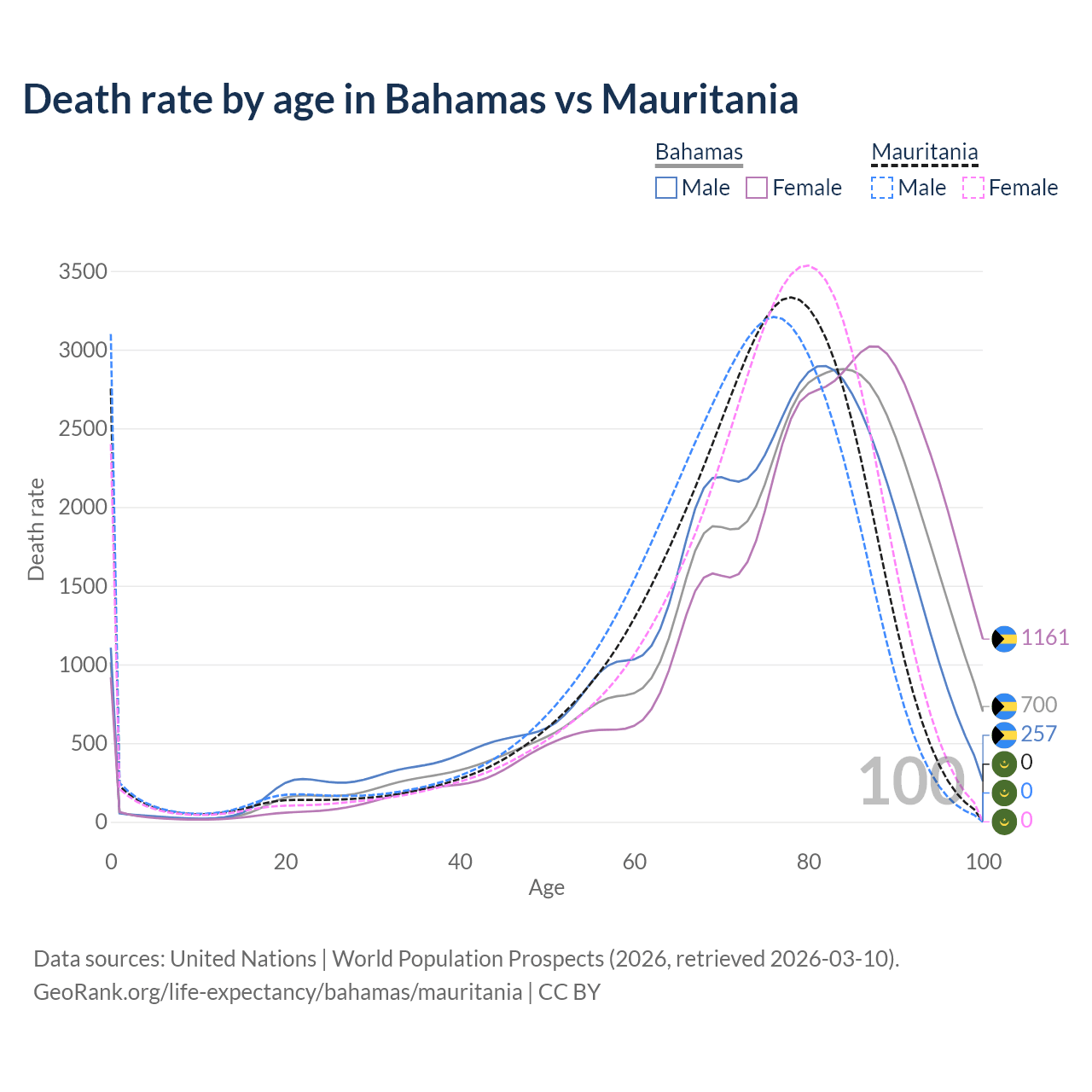 In the Bahamas, the most common age of death is 84, compared to 78 in Mauritania. The median age of death is 79.2 in the Bahamas and 74.1 in Mauritania, meaning only half of each cohort is expected to live past that age.