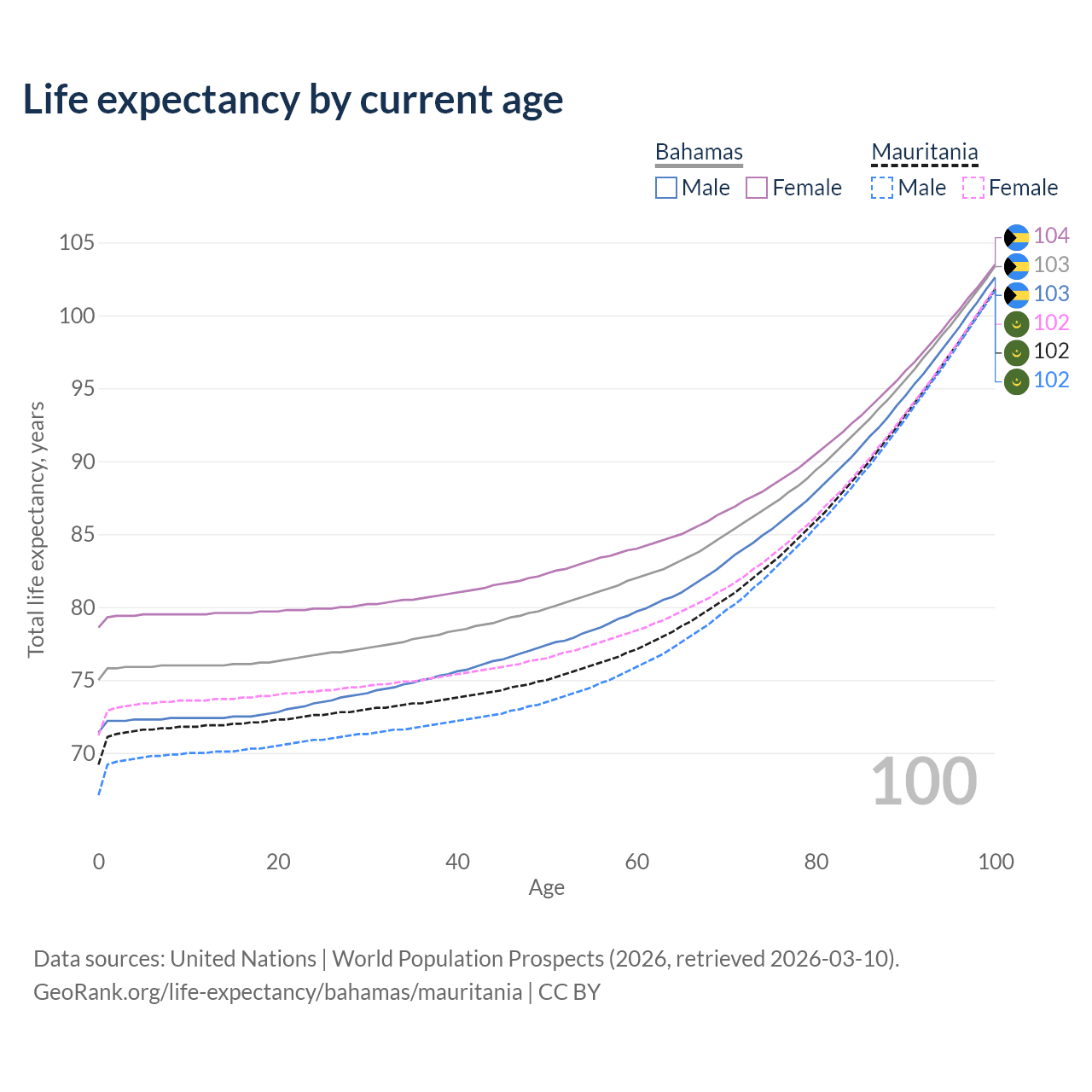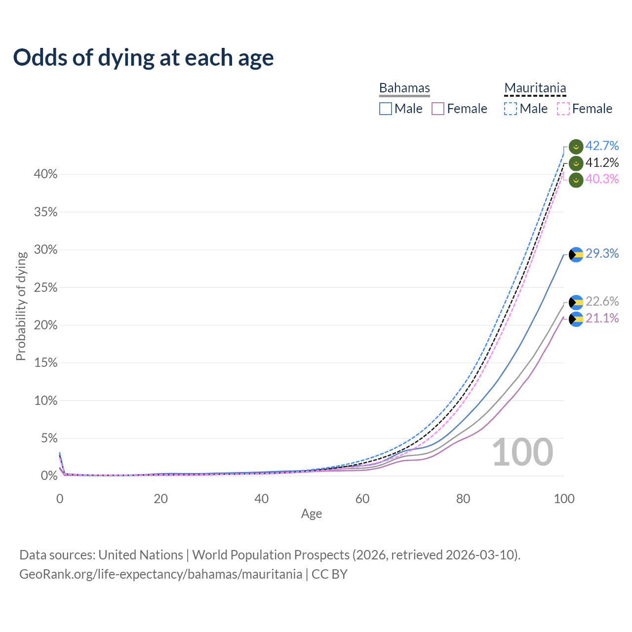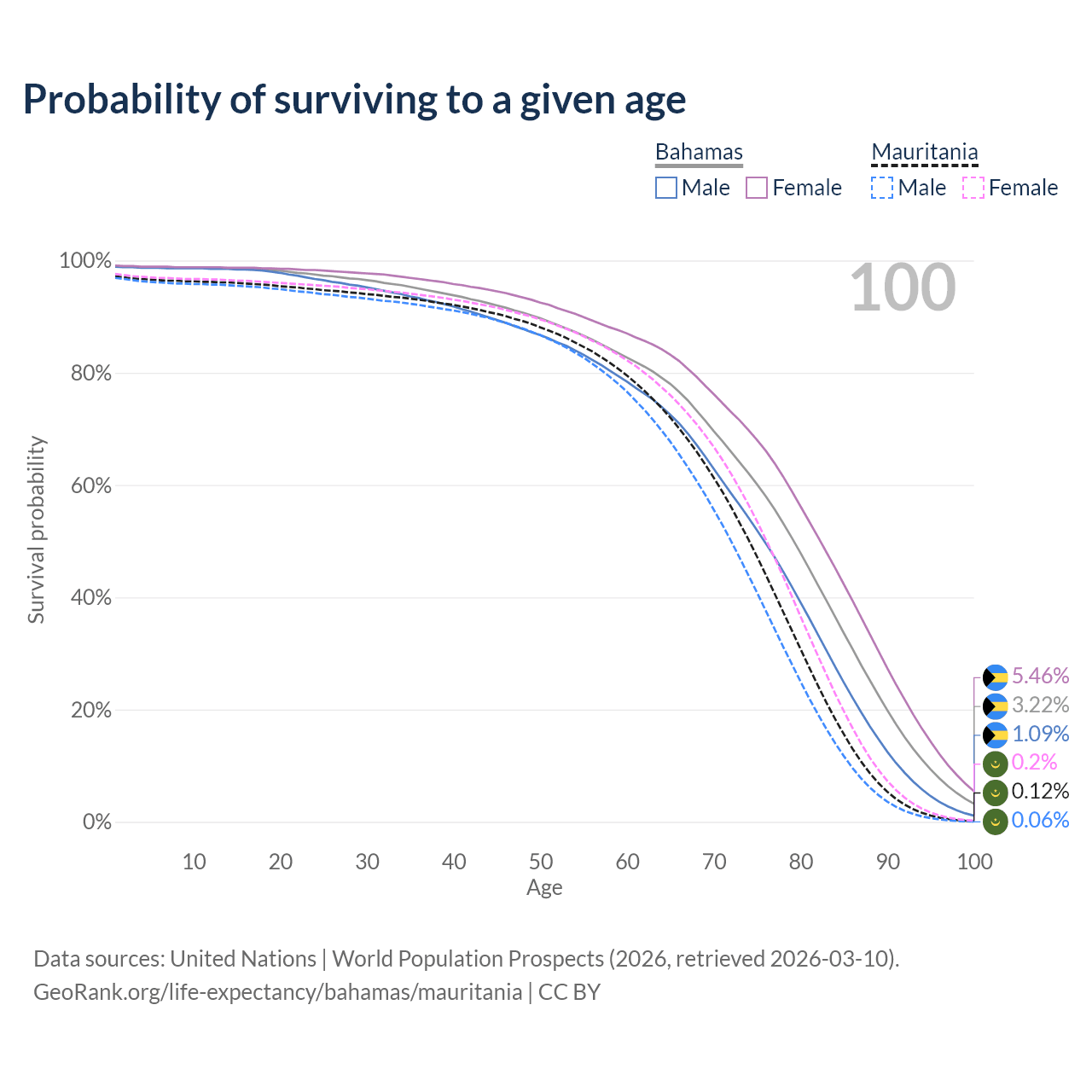 This life expectancy calculator shows the odds of living to 100, 95, 90, and below based on current age for both males and females in the Bahamas and Mauritania, along with mean and median age of death. The calculations are based on the 2026 life tables (actuarial tables) from the UN World Population Prospects.