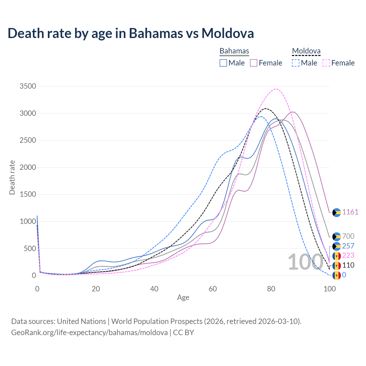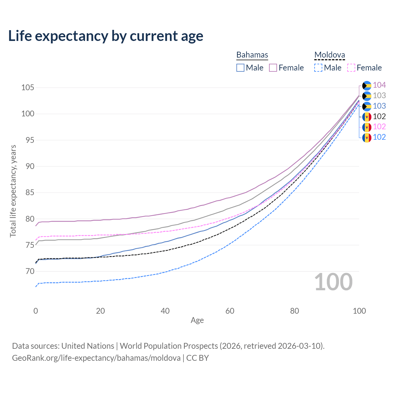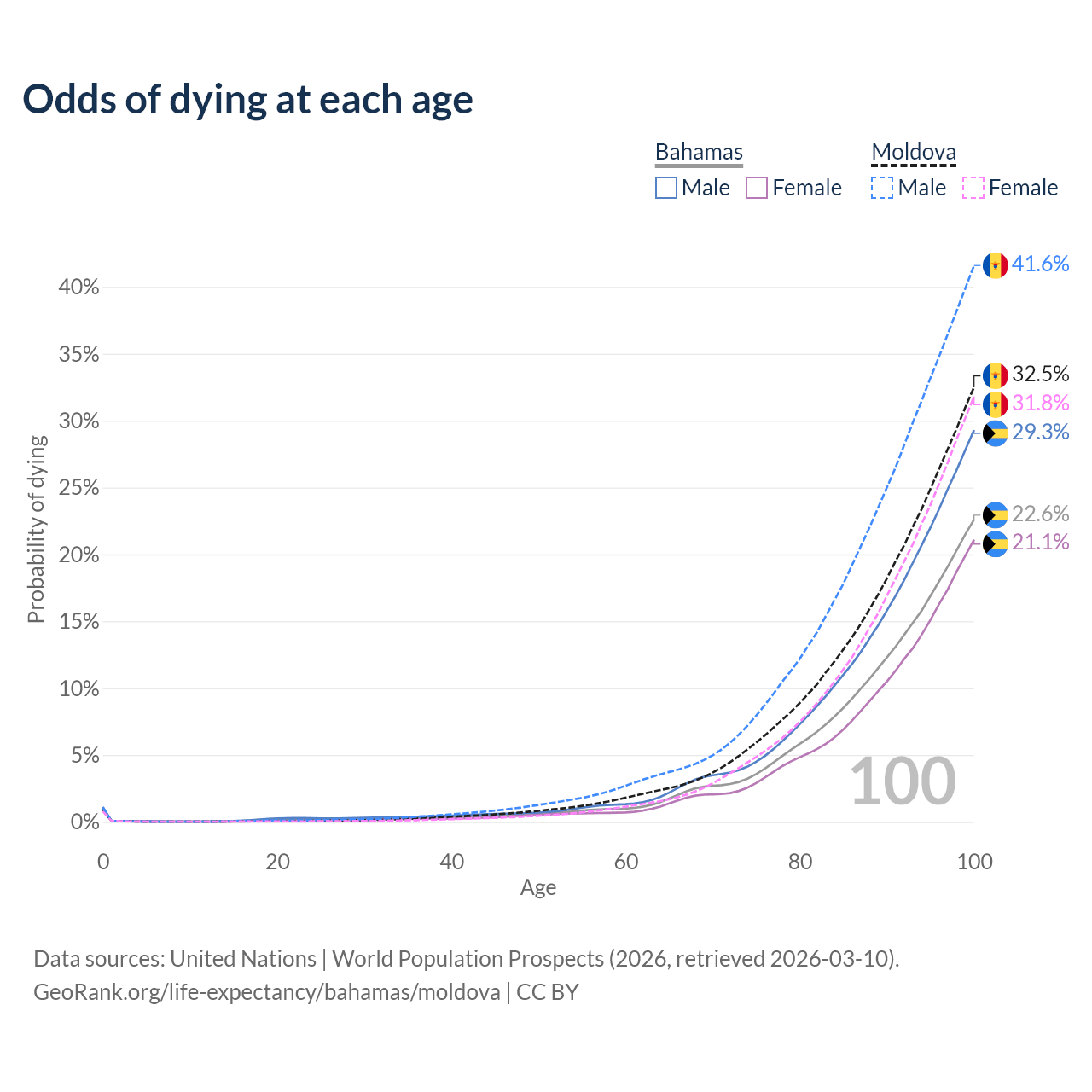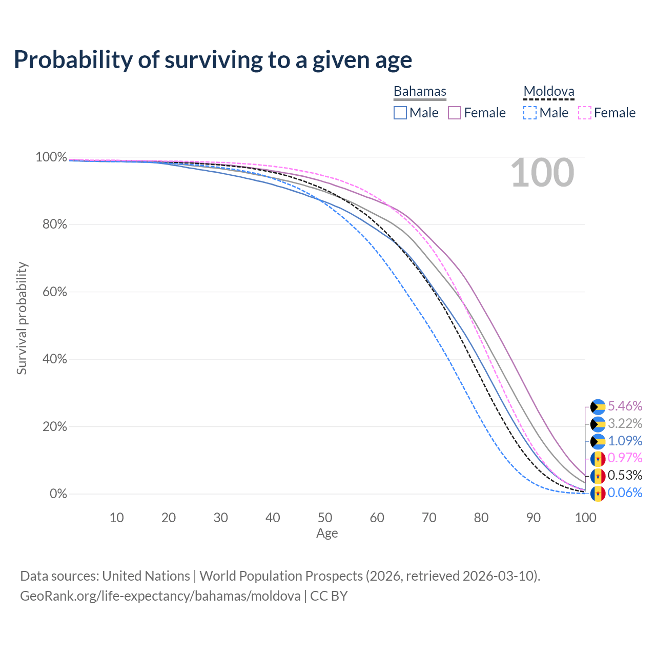 This life expectancy calculator shows the odds of living to 100, 95, 90, and below based on current age for both males and females in the Bahamas and Moldova, along with mean and median age of death. The calculations are based on the 2026 life tables (actuarial tables) from the UN World Population Prospects.
