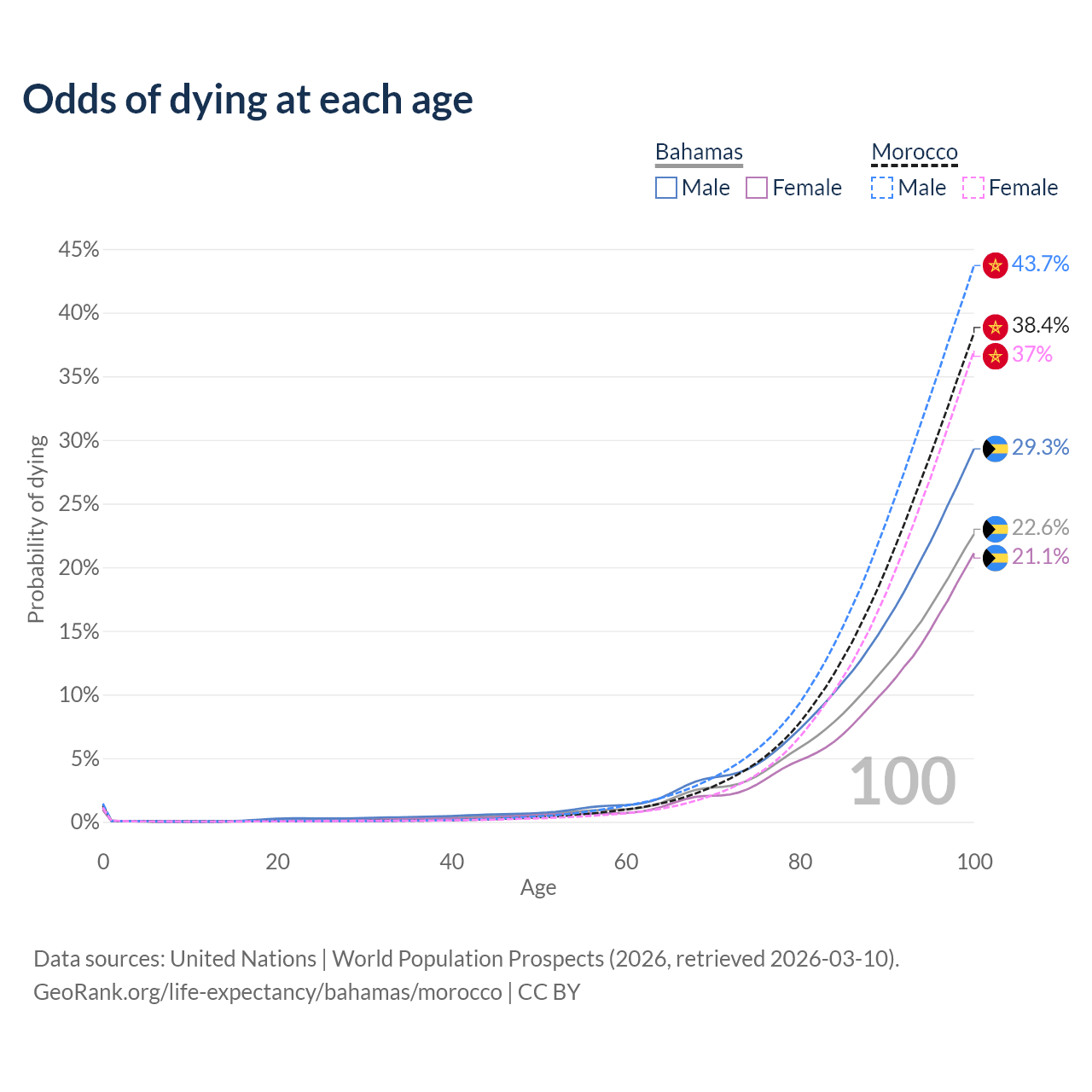 This life expectancy calculator shows the odds of living to 100, 95, 90, and below based on current age for both males and females in the Bahamas and Morocco, along with mean and median age of death. The calculations are based on the 2026 life tables (actuarial tables) from the UN World Population Prospects.