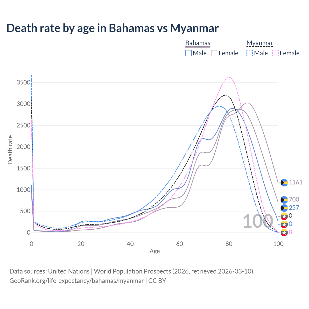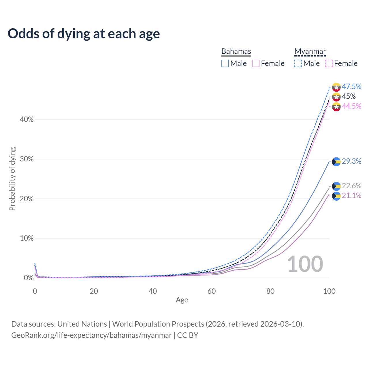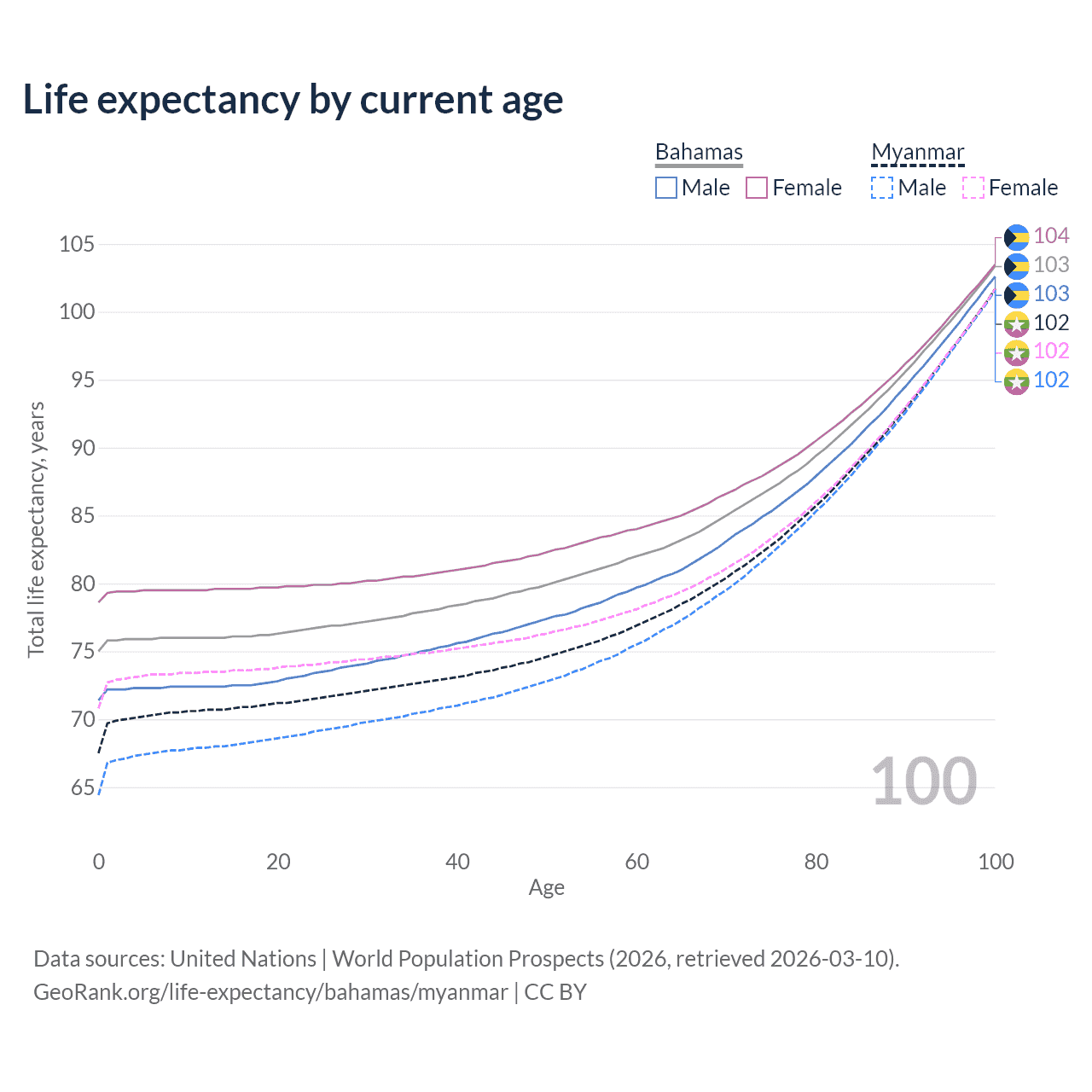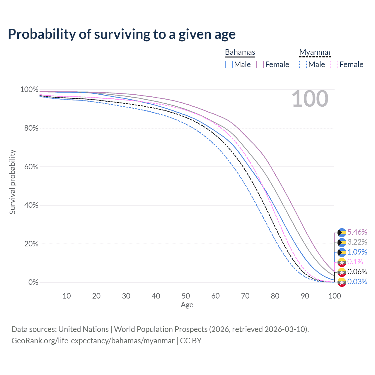 This life expectancy calculator shows the odds of living to 100, 95, 90, and below based on current age for both males and females in the Bahamas and Myanmar, along with mean and median age of death. The calculations are based on the 2026 life tables (actuarial tables) from the UN World Population Prospects.