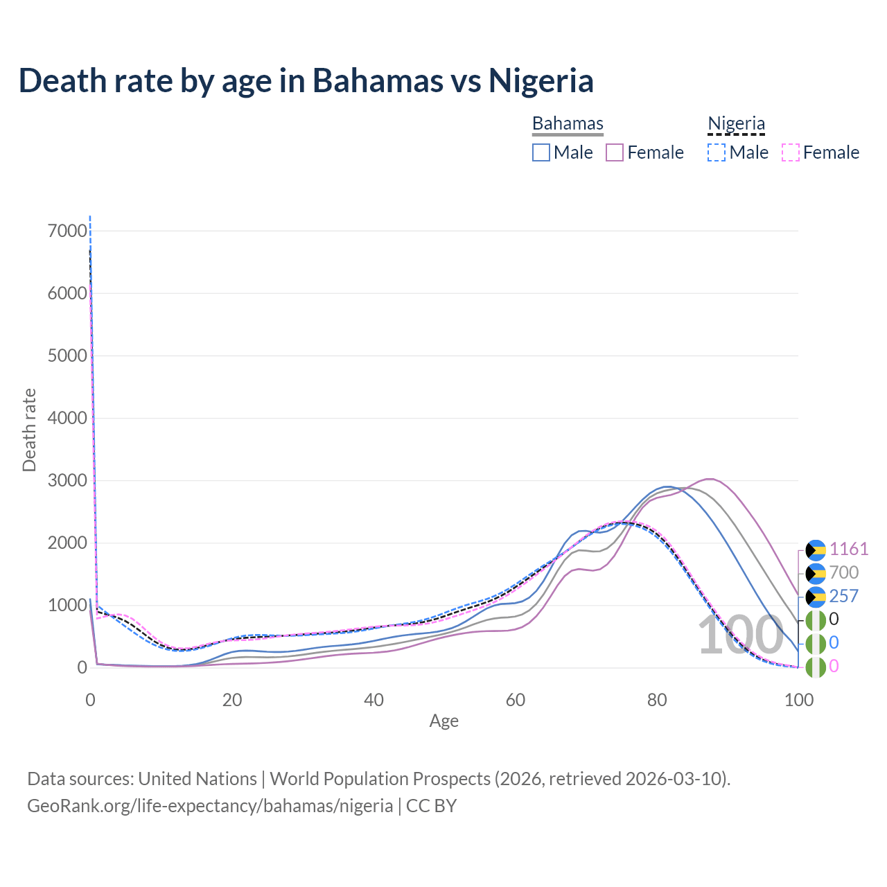 In the Bahamas, the most common age of death is 84, compared to 0 in Nigeria. The median age of death is 79.2 in the Bahamas and 64.3 in Nigeria, meaning only half of each cohort is expected to live past that age.