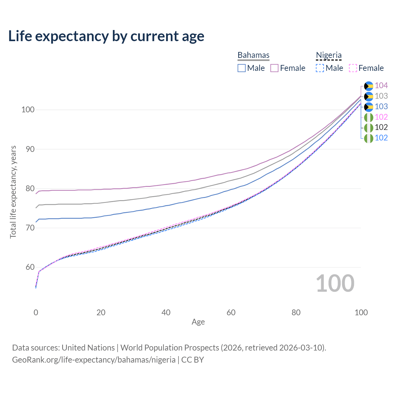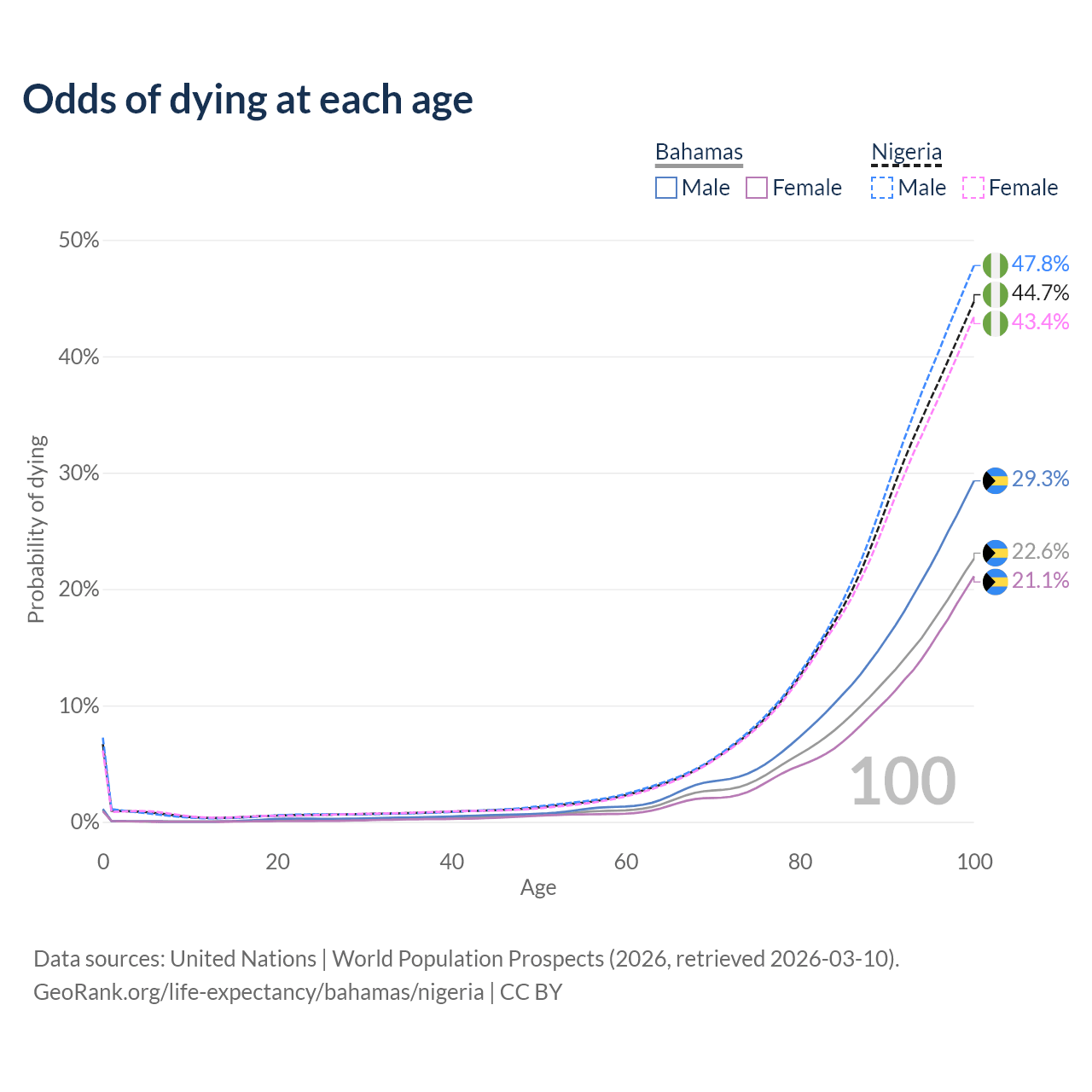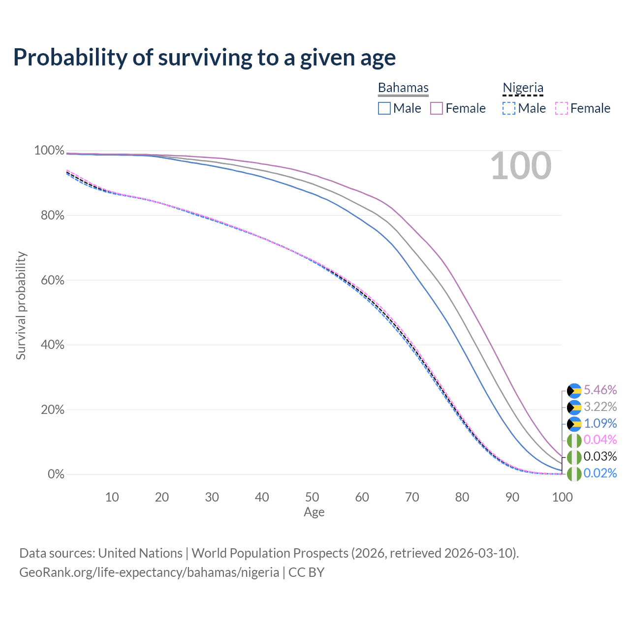 This life expectancy calculator shows the odds of living to 100, 95, 90, and below based on current age for both males and females in the Bahamas and Nigeria, along with mean and median age of death. The calculations are based on the 2026 life tables (actuarial tables) from the UN World Population Prospects.