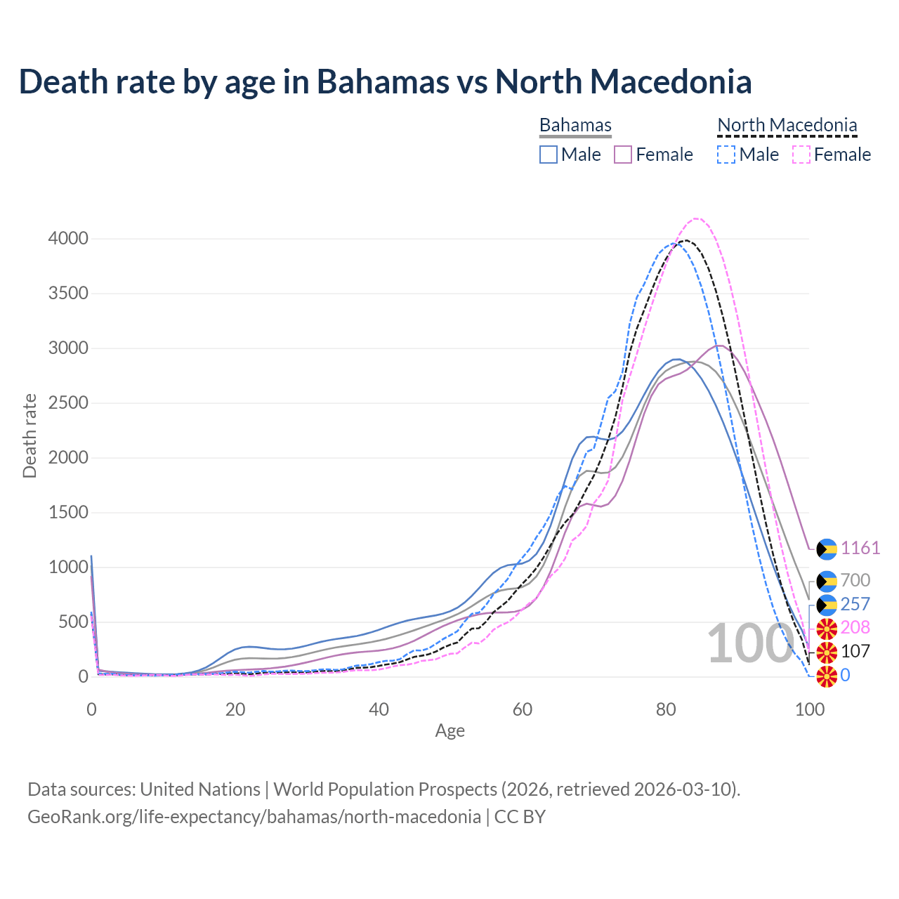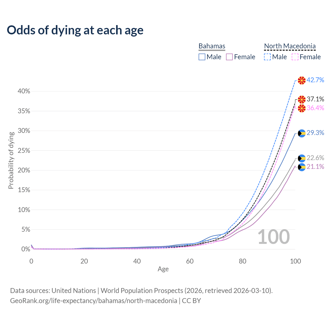 This life expectancy calculator shows the odds of living to 100, 95, 90, and below based on current age for both males and females in the Bahamas and North Macedonia, along with mean and median age of death. The calculations are based on the 2026 life tables (actuarial tables) from the UN World Population Prospects.