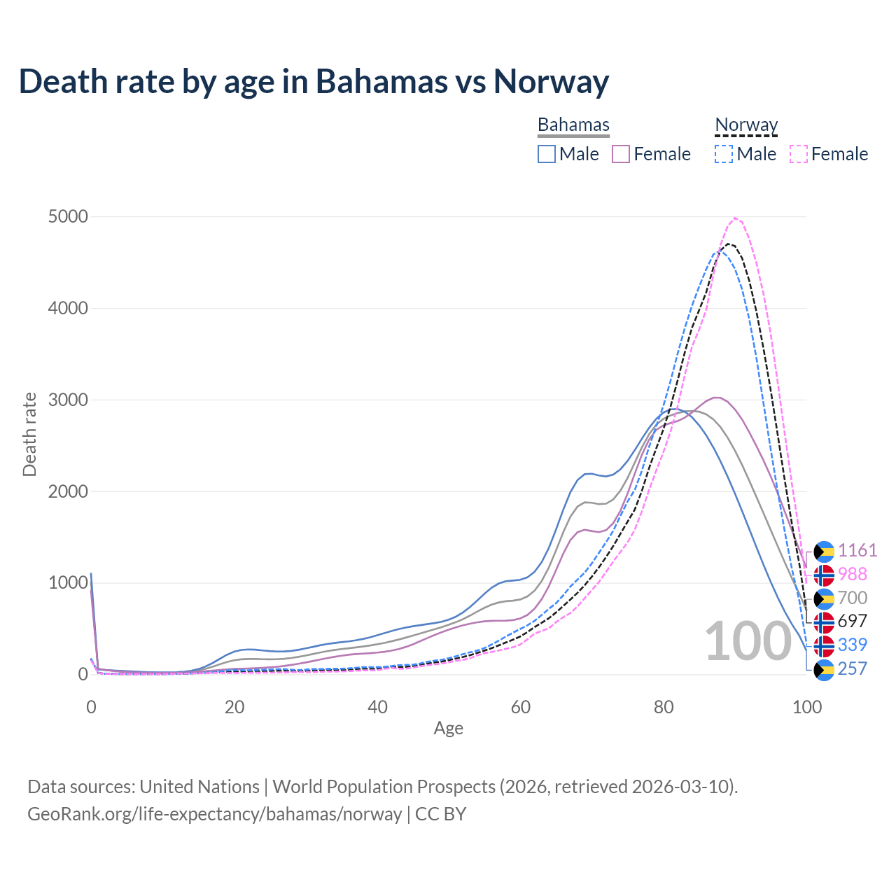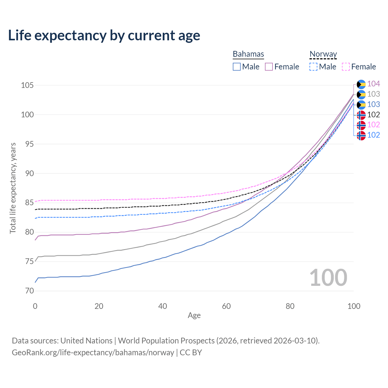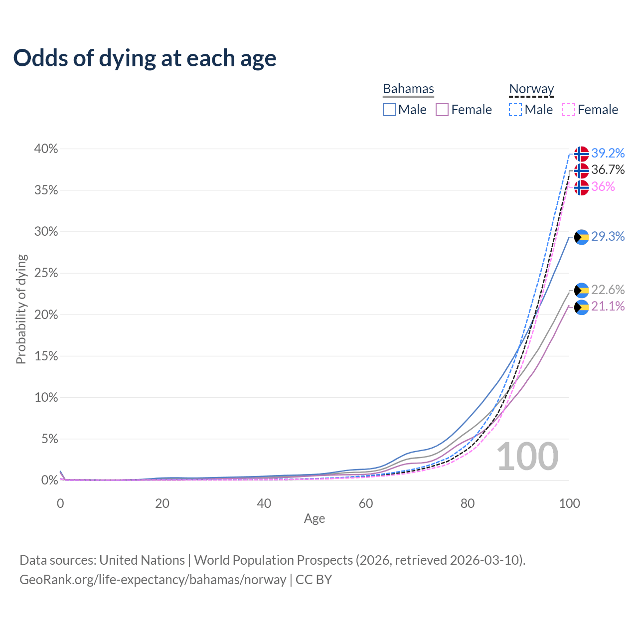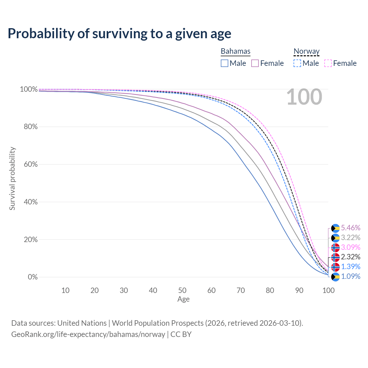 This life expectancy calculator shows the odds of living to 100, 95, 90, and below based on current age for both males and females in the Bahamas and Norway, along with mean and median age of death. The calculations are based on the 2026 life tables (actuarial tables) from the UN World Population Prospects.