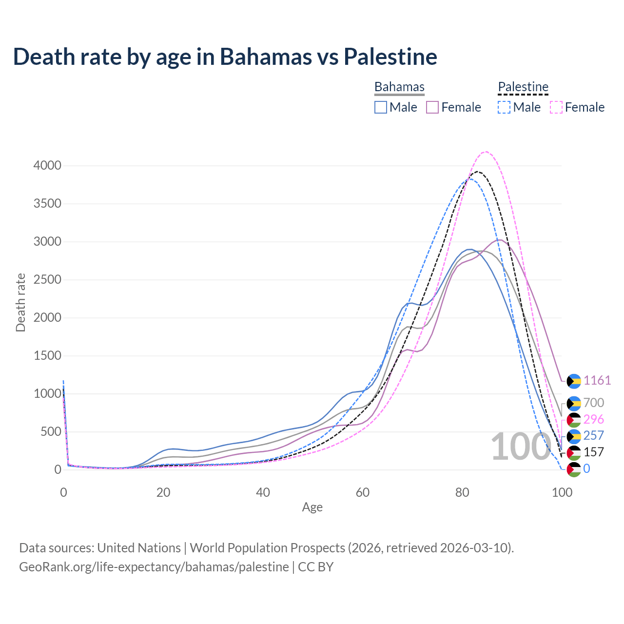 In the Bahamas, the most common age of death is 84, compared to 83 in Palestine. The median age of death is 79.2 in the Bahamas and 80.5 in Palestine, meaning only half of each cohort is expected to live past that age.