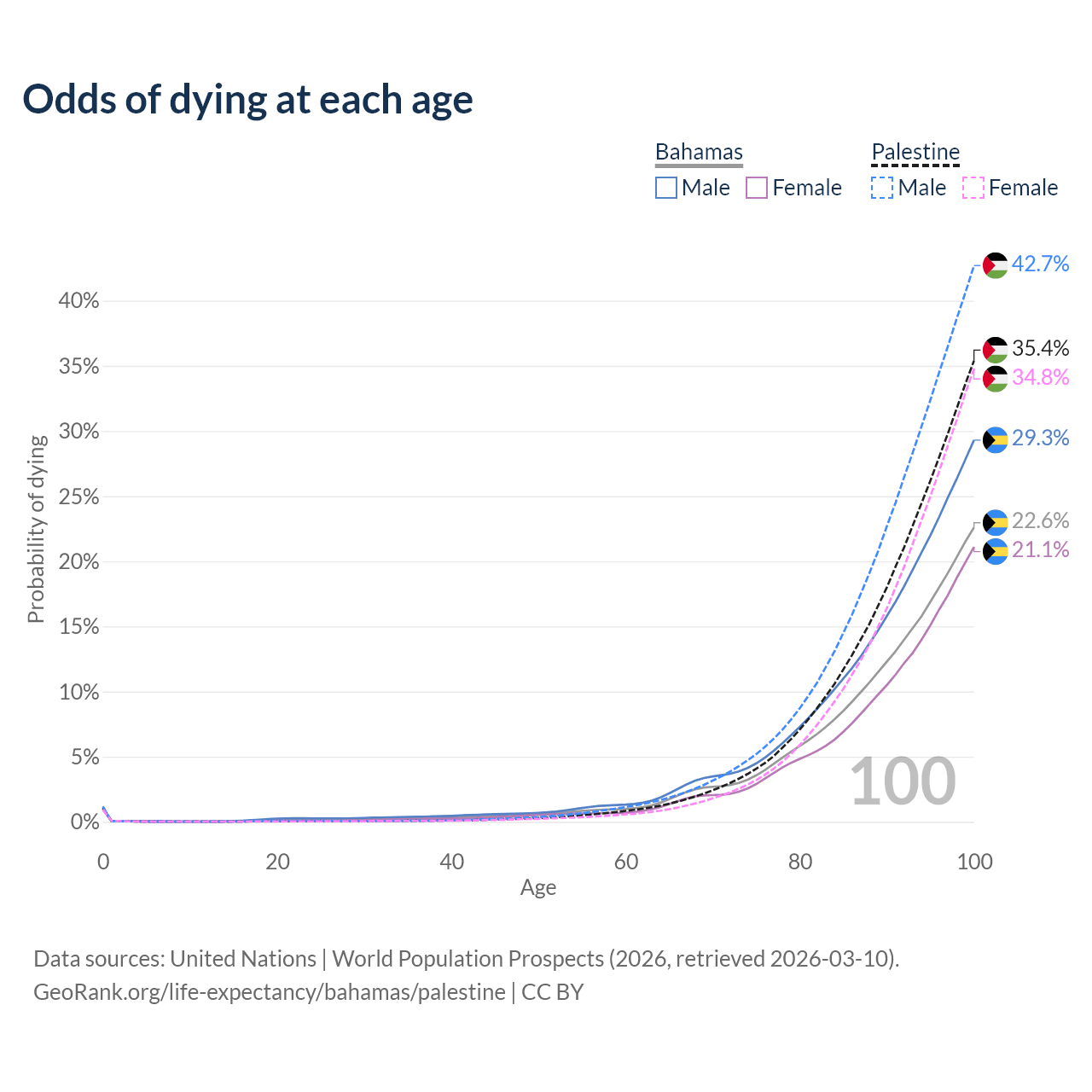 This life expectancy calculator shows the odds of living to 100, 95, 90, and below based on current age for both males and females in the Bahamas and Palestine, along with mean and median age of death. The calculations are based on the 2026 life tables (actuarial tables) from the UN World Population Prospects.