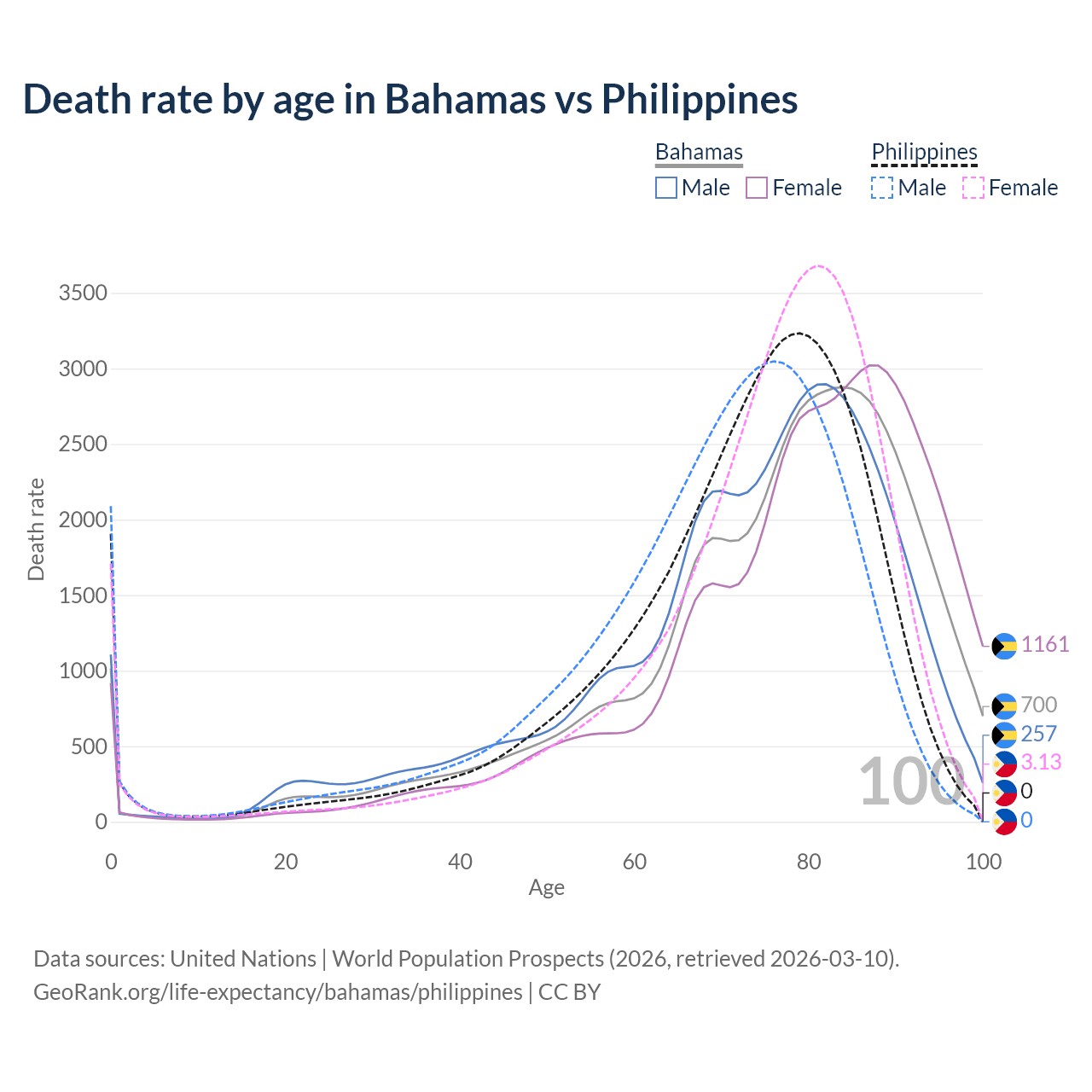 In the Bahamas, the most common age of death is 84, compared to 79 in the Philippines. The median age of death is 79.2 in the Bahamas and 74.6 in the Philippines, meaning only half of each cohort is expected to live past that age.