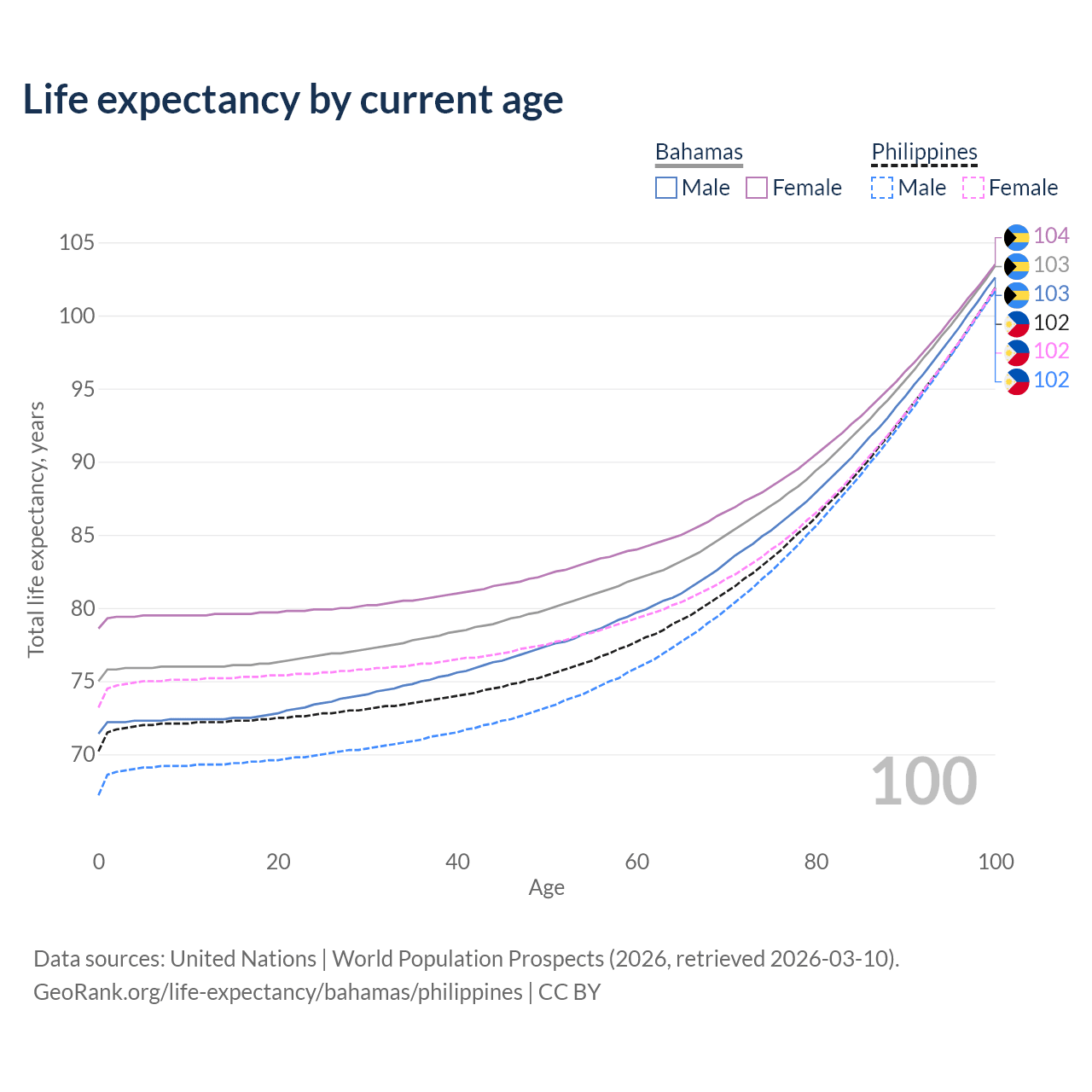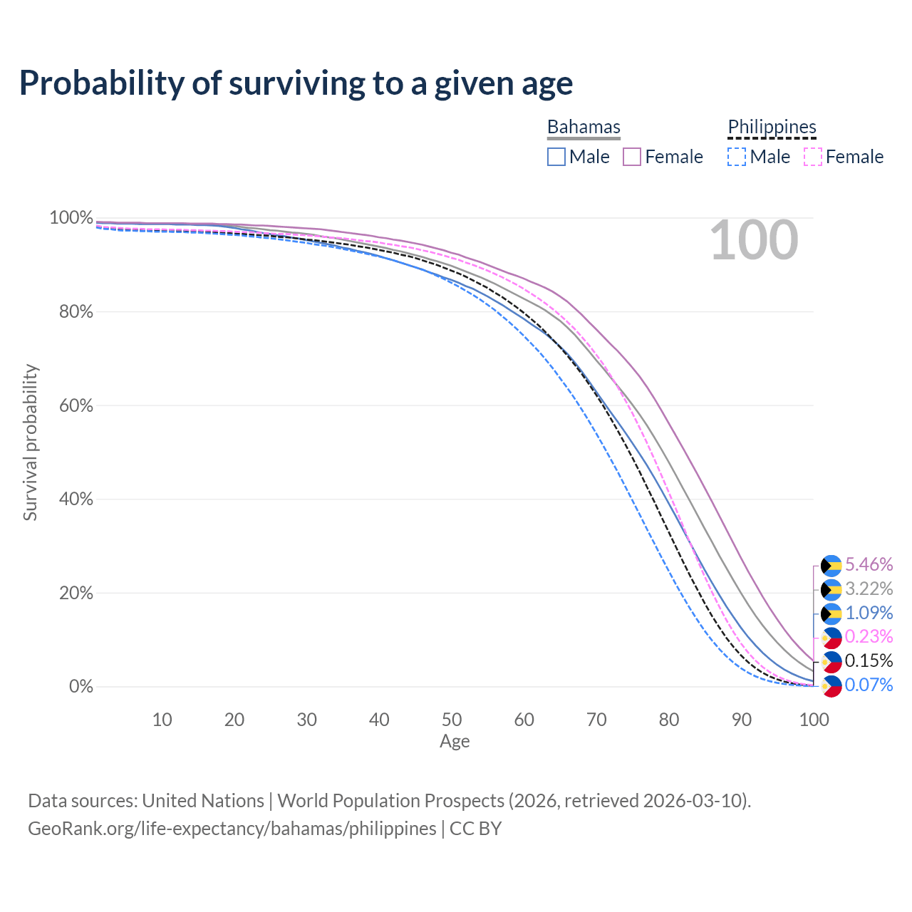 This life expectancy calculator shows the odds of living to 100, 95, 90, and below based on current age for both males and females in the Bahamas and the Philippines, along with mean and median age of death. The calculations are based on the 2026 life tables (actuarial tables) from the UN World Population Prospects.