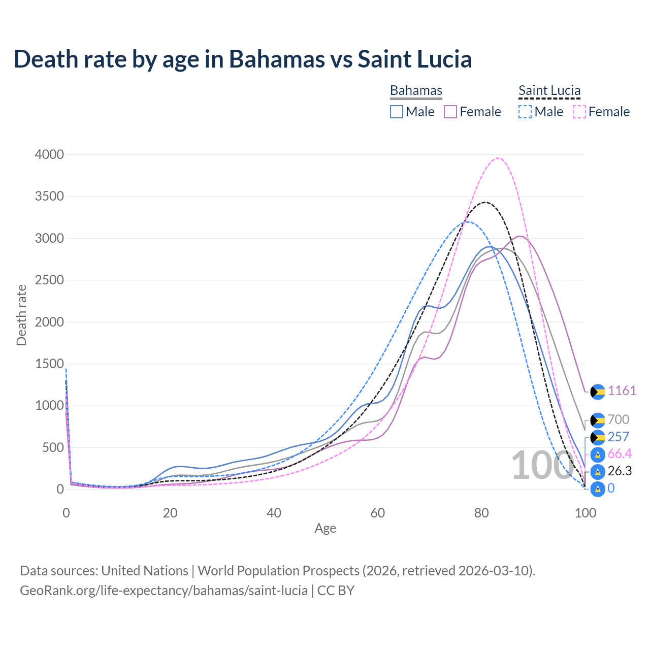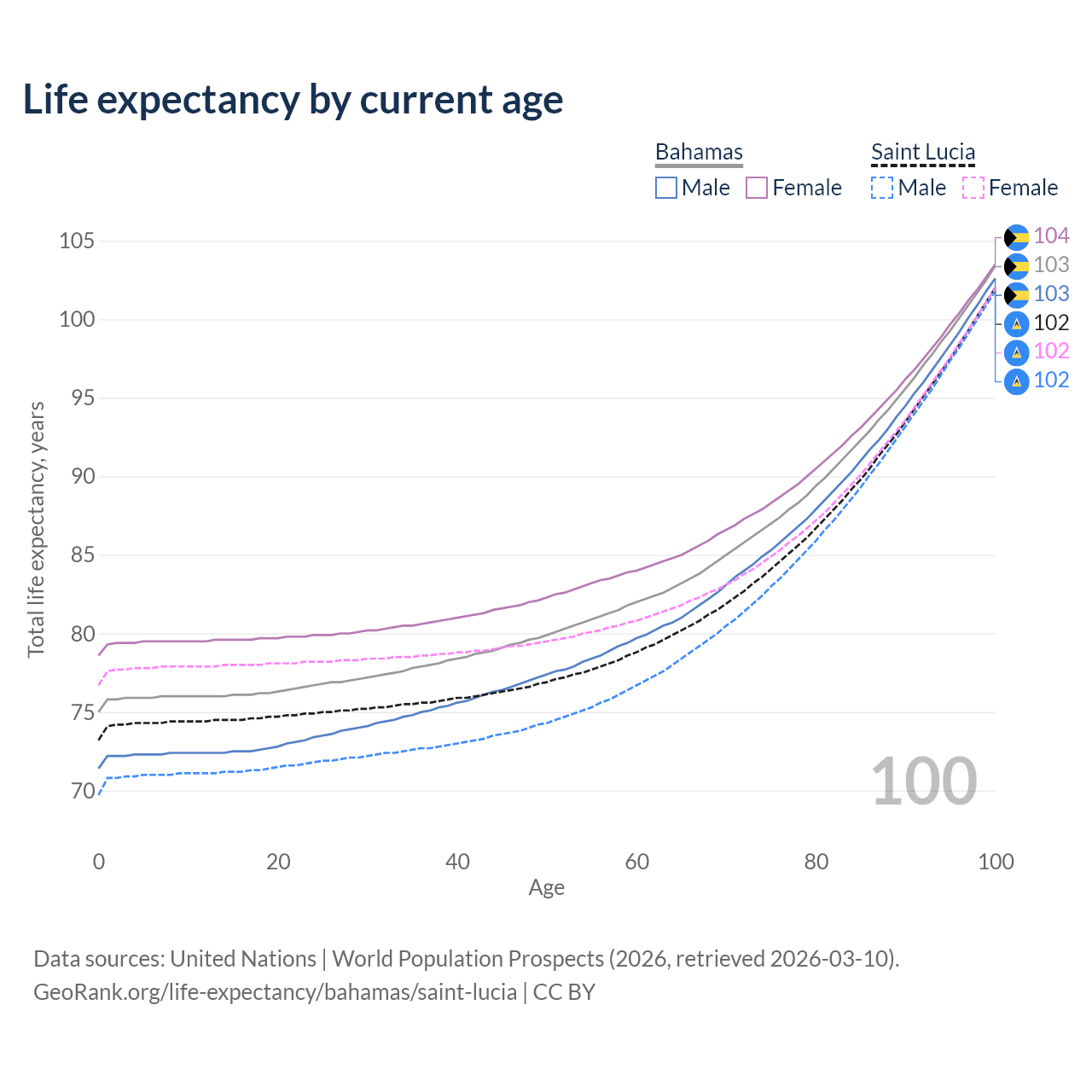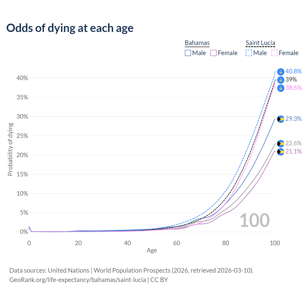 This life expectancy calculator shows the odds of living to 100, 95, 90, and below based on current age for both males and females in the Bahamas and Saint Lucia, along with mean and median age of death. The calculations are based on the 2026 life tables (actuarial tables) from the UN World Population Prospects.