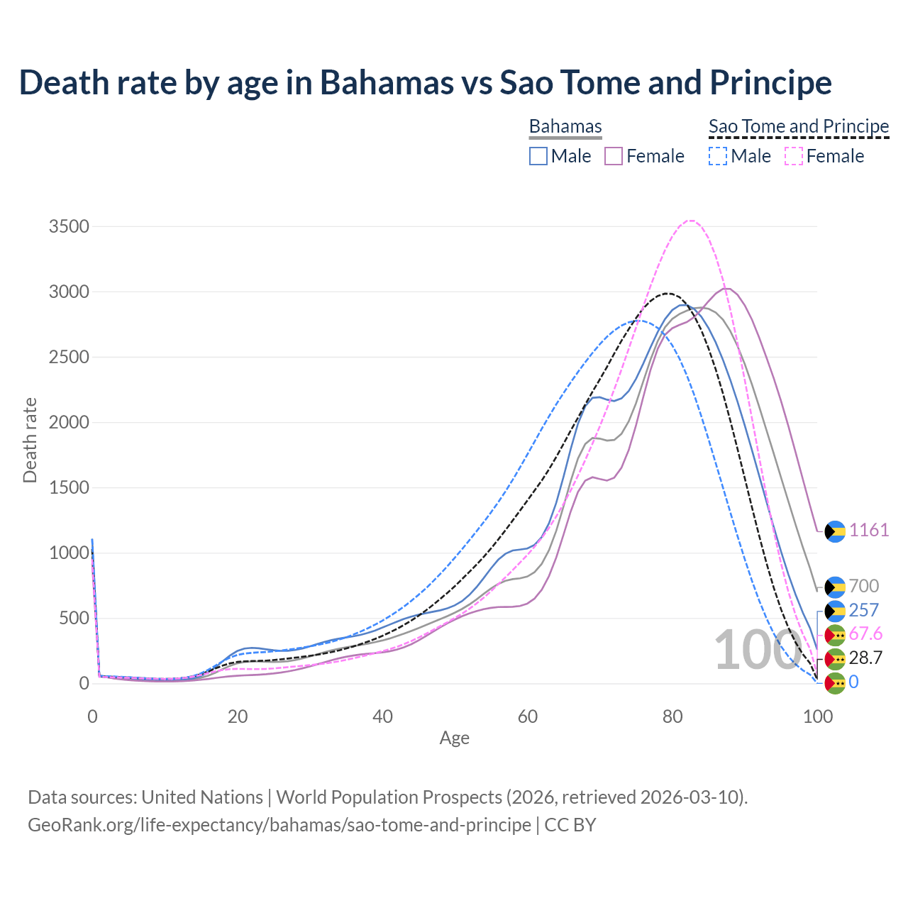 In the Bahamas, the most common age of death is 84, compared to 79 in Sao Tome and Principe. The median age of death is 79.2 in the Bahamas and 74.1 in Sao Tome and Principe, meaning only half of each cohort is expected to live past that age.
