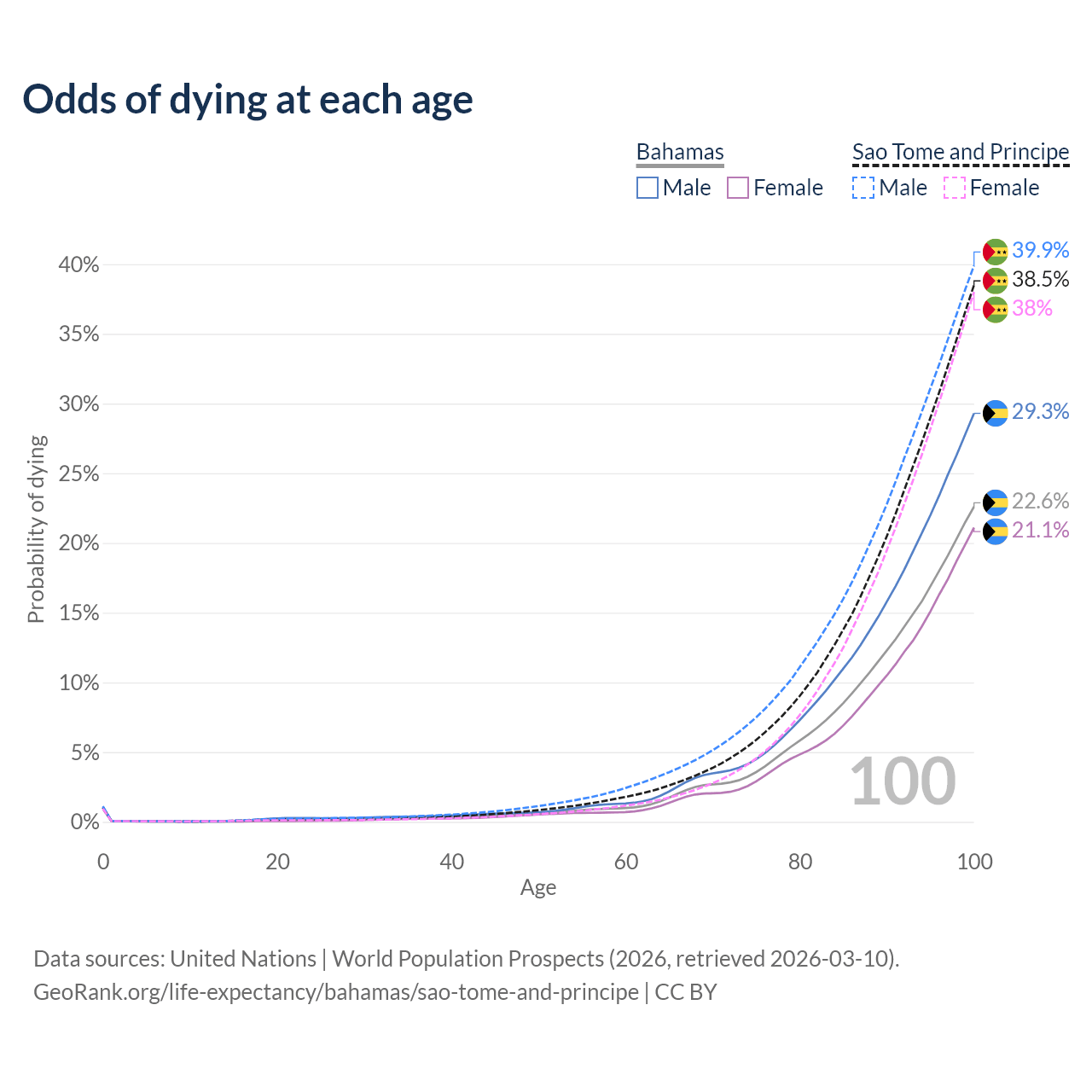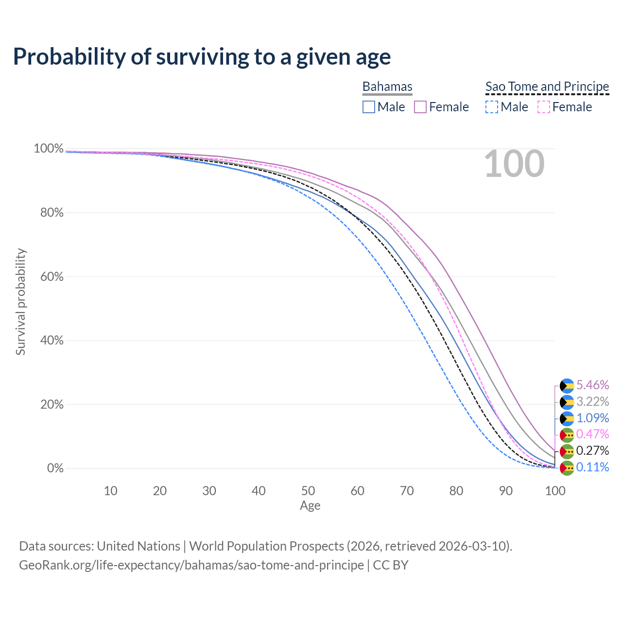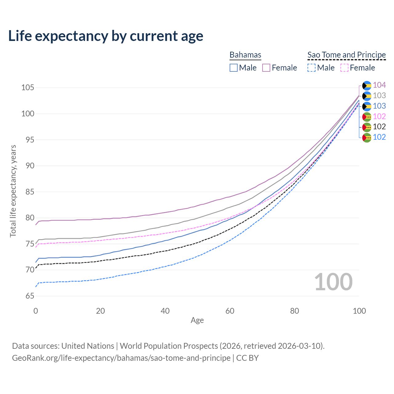 This life expectancy calculator shows the odds of living to 100, 95, 90, and below based on current age for both males and females in the Bahamas and Sao Tome and Principe, along with mean and median age of death. The calculations are based on the 2026 life tables (actuarial tables) from the UN World Population Prospects.