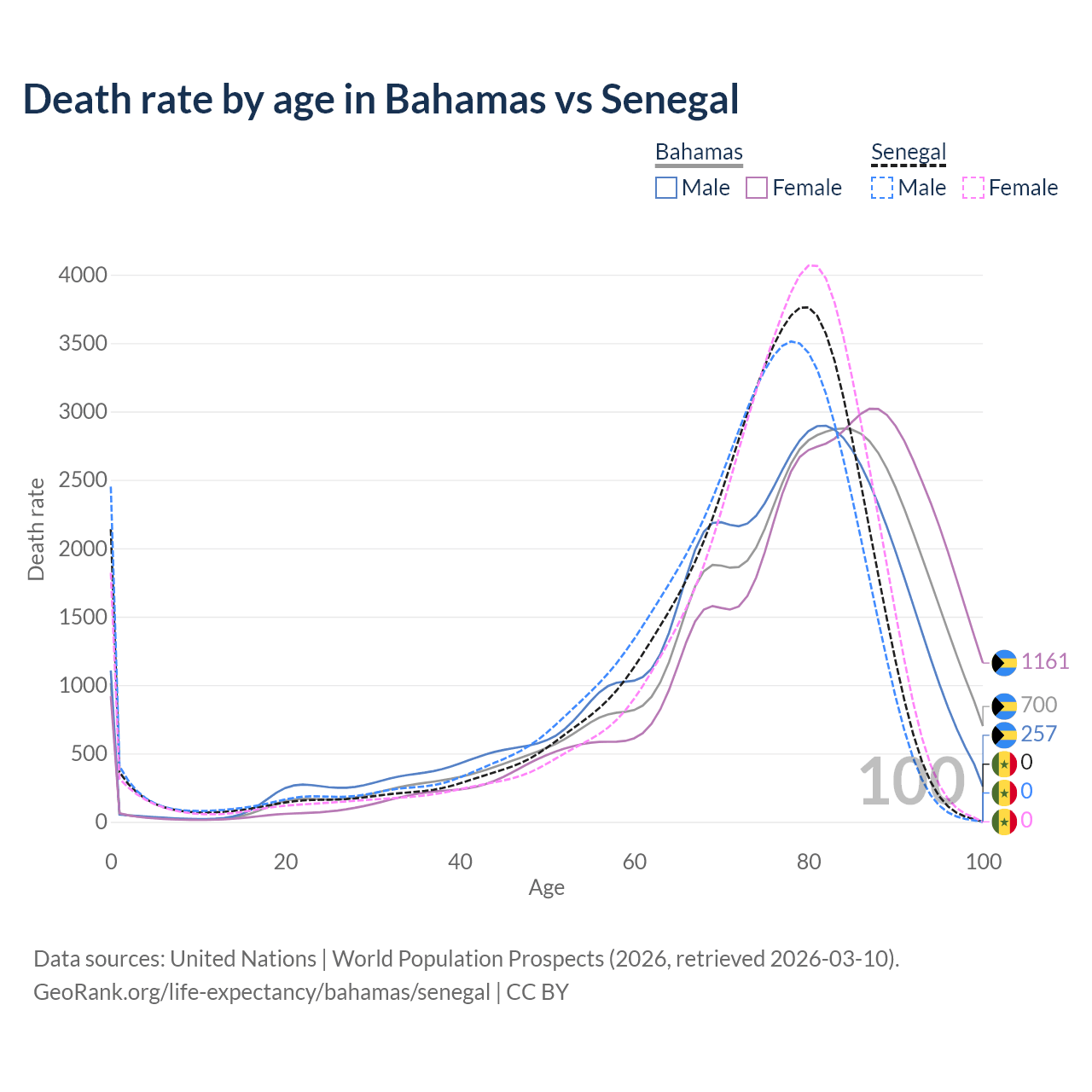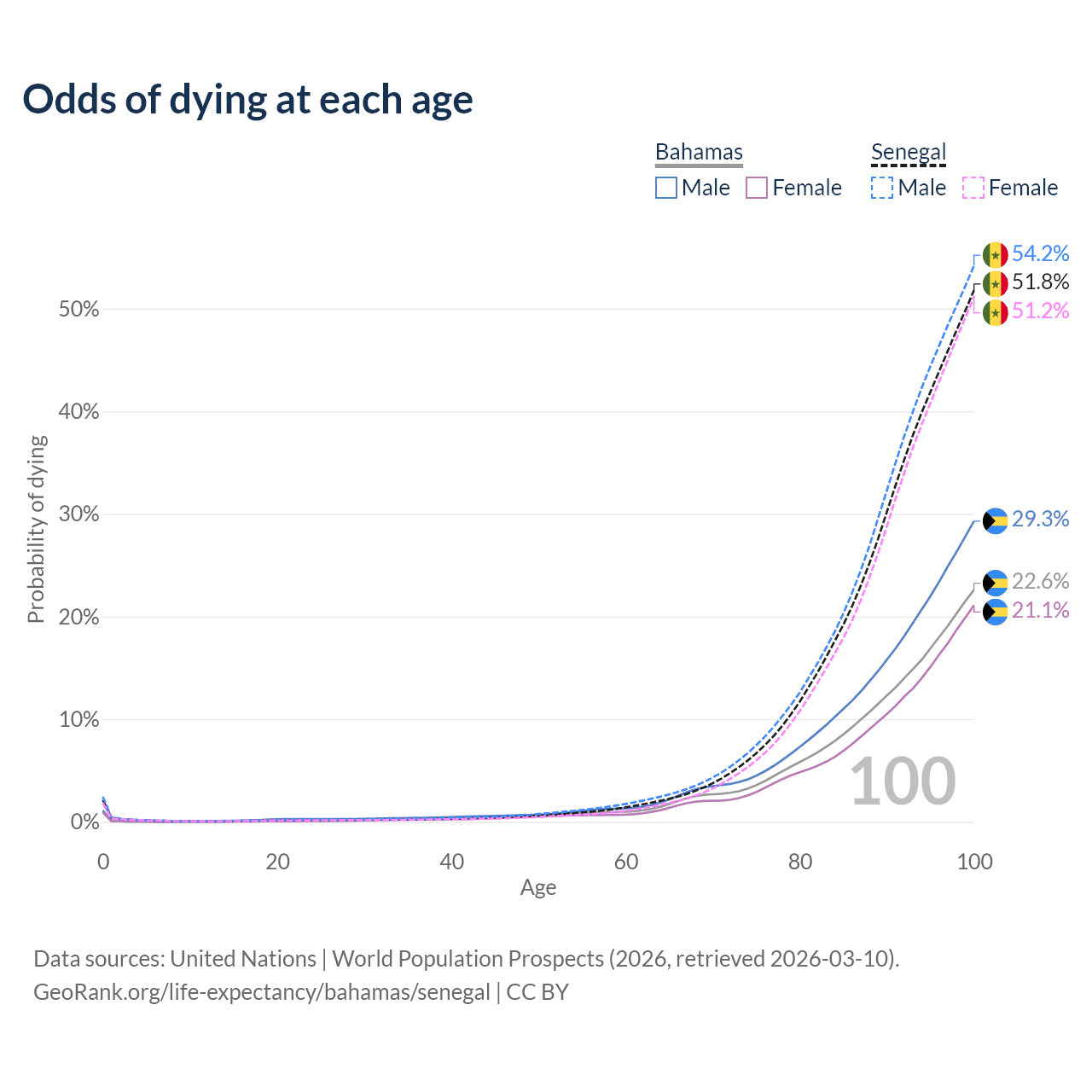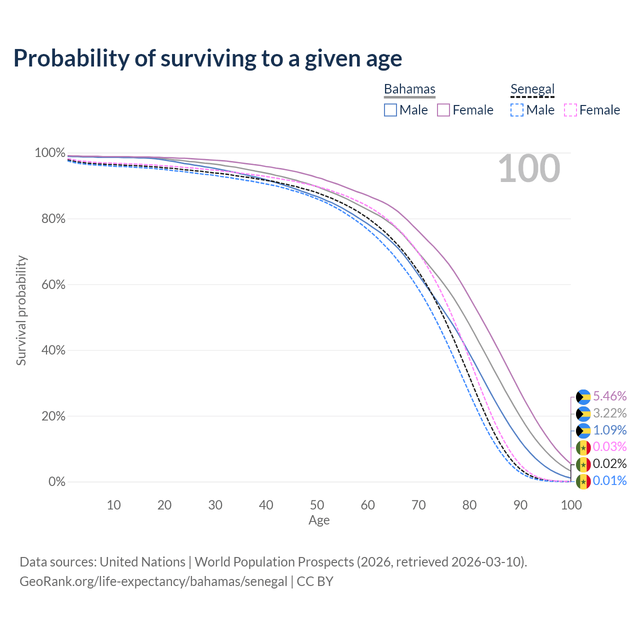 This life expectancy calculator shows the odds of living to 100, 95, 90, and below based on current age for both males and females in the Bahamas and Senegal, along with mean and median age of death. The calculations are based on the 2026 life tables (actuarial tables) from the UN World Population Prospects.