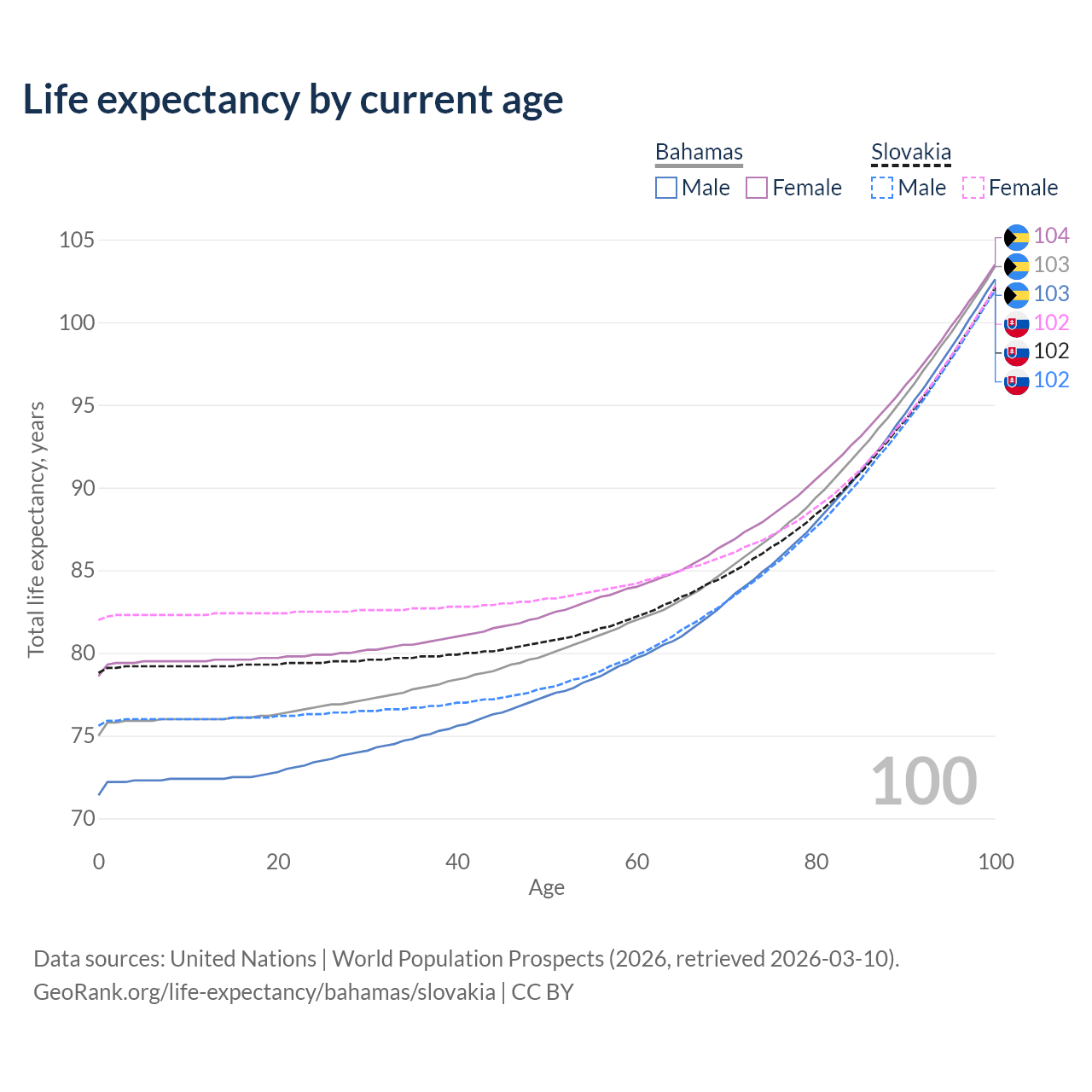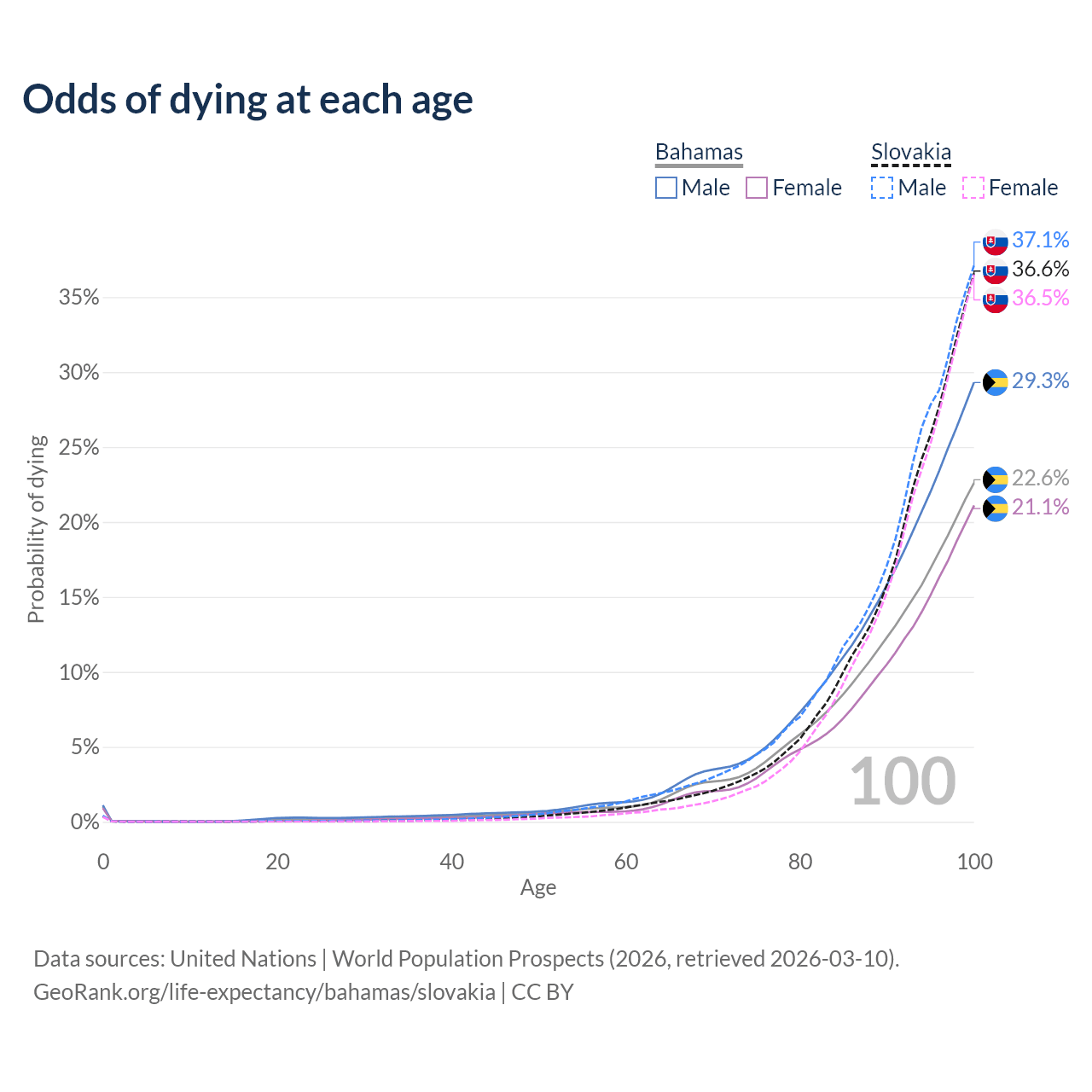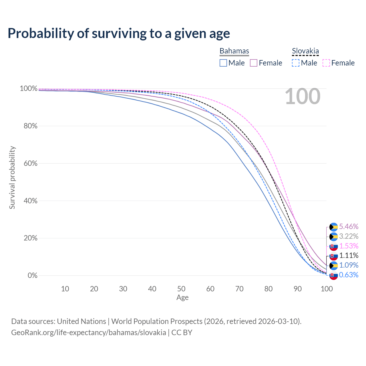 This life expectancy calculator shows the odds of living to 100, 95, 90, and below based on current age for both males and females in the Bahamas and Slovakia, along with mean and median age of death. The calculations are based on the 2026 life tables (actuarial tables) from the UN World Population Prospects.