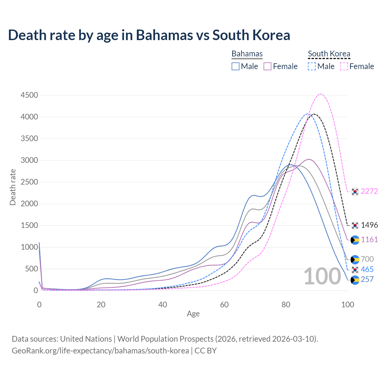 In the Bahamas, the most common age of death is 84, compared to 89 in South Korea. The median age of death is 79.2 in the Bahamas and 86.8 in South Korea, meaning only half of each cohort is expected to live past that age.