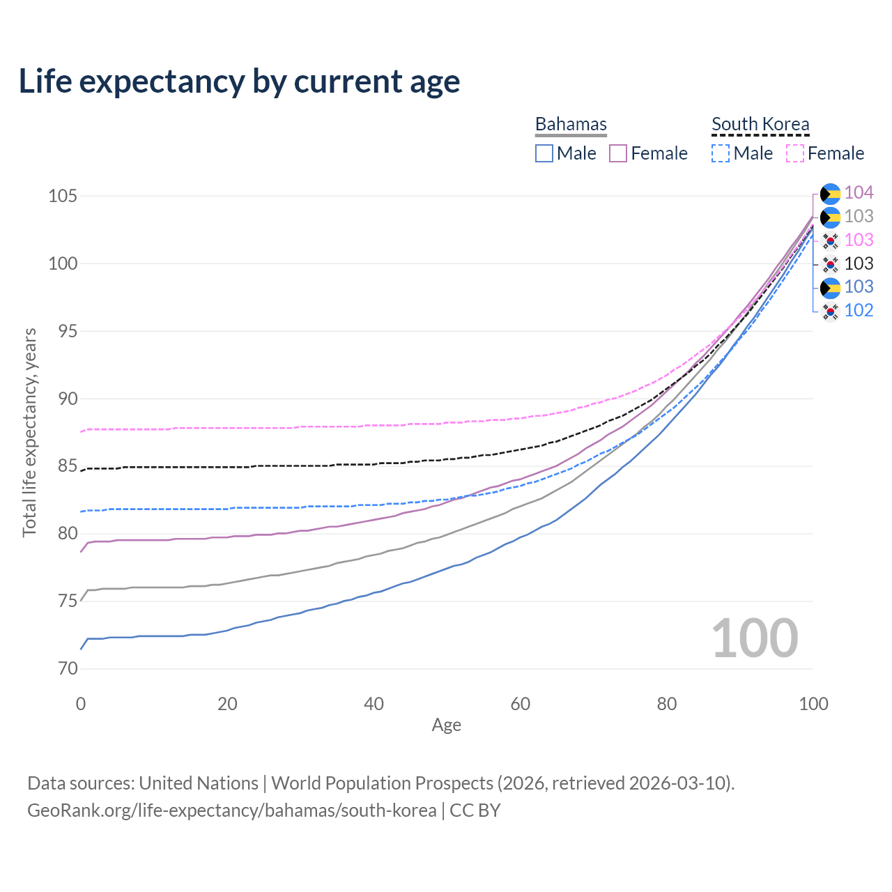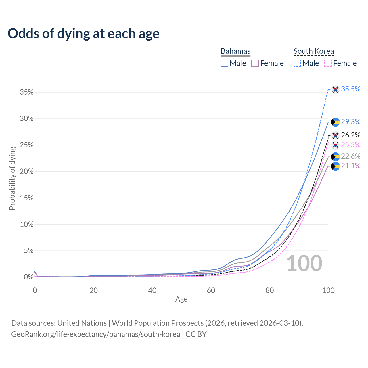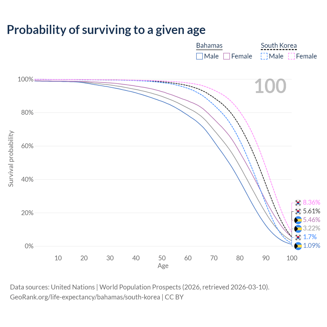 This life expectancy calculator shows the odds of living to 100, 95, 90, and below based on current age for both males and females in the Bahamas and South Korea, along with mean and median age of death. The calculations are based on the 2026 life tables (actuarial tables) from the UN World Population Prospects.