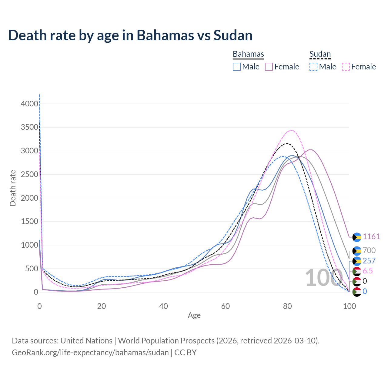 The average life expectancy at birth is 75 years in the Bahamas vs 66.9 in Sudan. The Bahamas is ranked 95/197 by life expectancy, and Sudan is 160/197. In the Bahamas, the life expectancy is 71.4 years for males and 78.6 years for females. In Sudan, it's 63.8 years for males and 70.2 years for females.