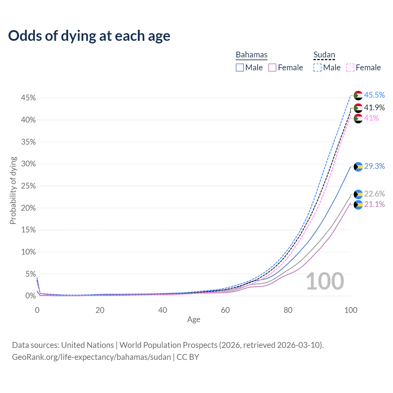 This life expectancy calculator shows the odds of living to 100, 95, 90, and below based on current age for both males and females in the Bahamas and Sudan, along with mean and median age of death. The calculations are based on the 2026 life tables (actuarial tables) from the UN World Population Prospects.