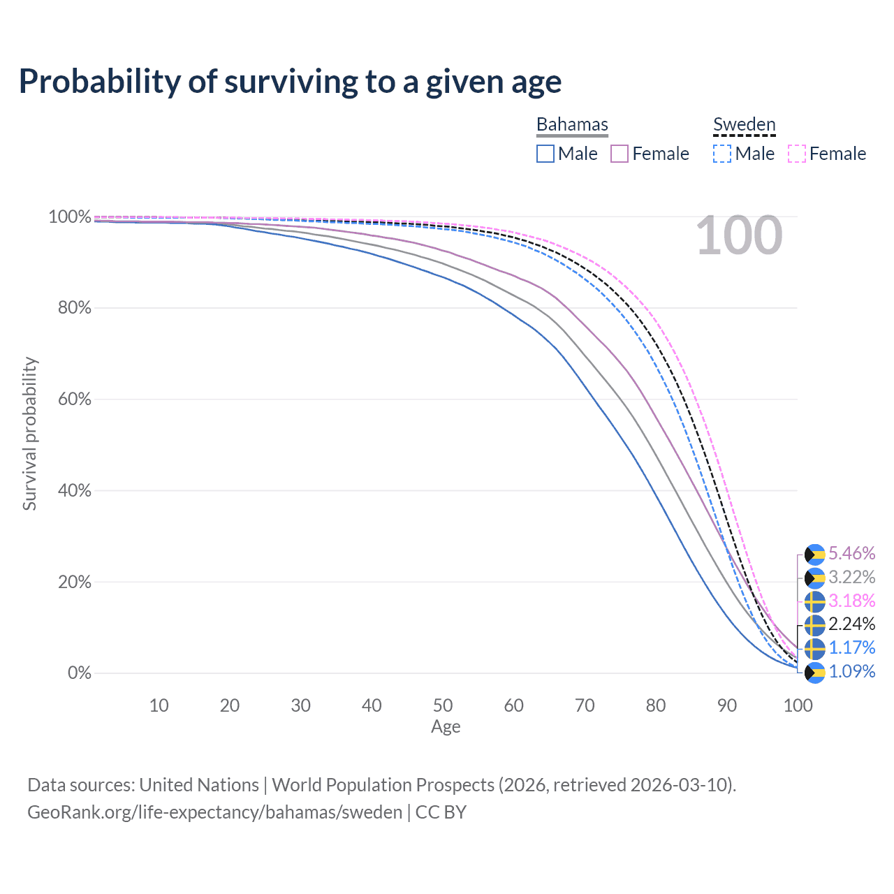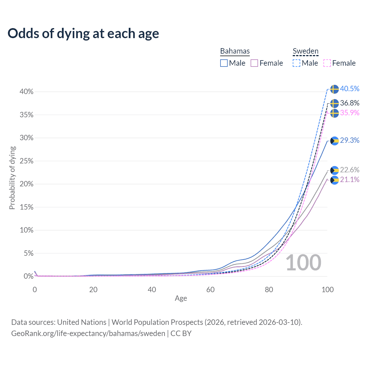 This life expectancy calculator shows the odds of living to 100, 95, 90, and below based on current age for both males and females in the Bahamas and Sweden, along with mean and median age of death. The calculations are based on the 2026 life tables (actuarial tables) from the UN World Population Prospects.