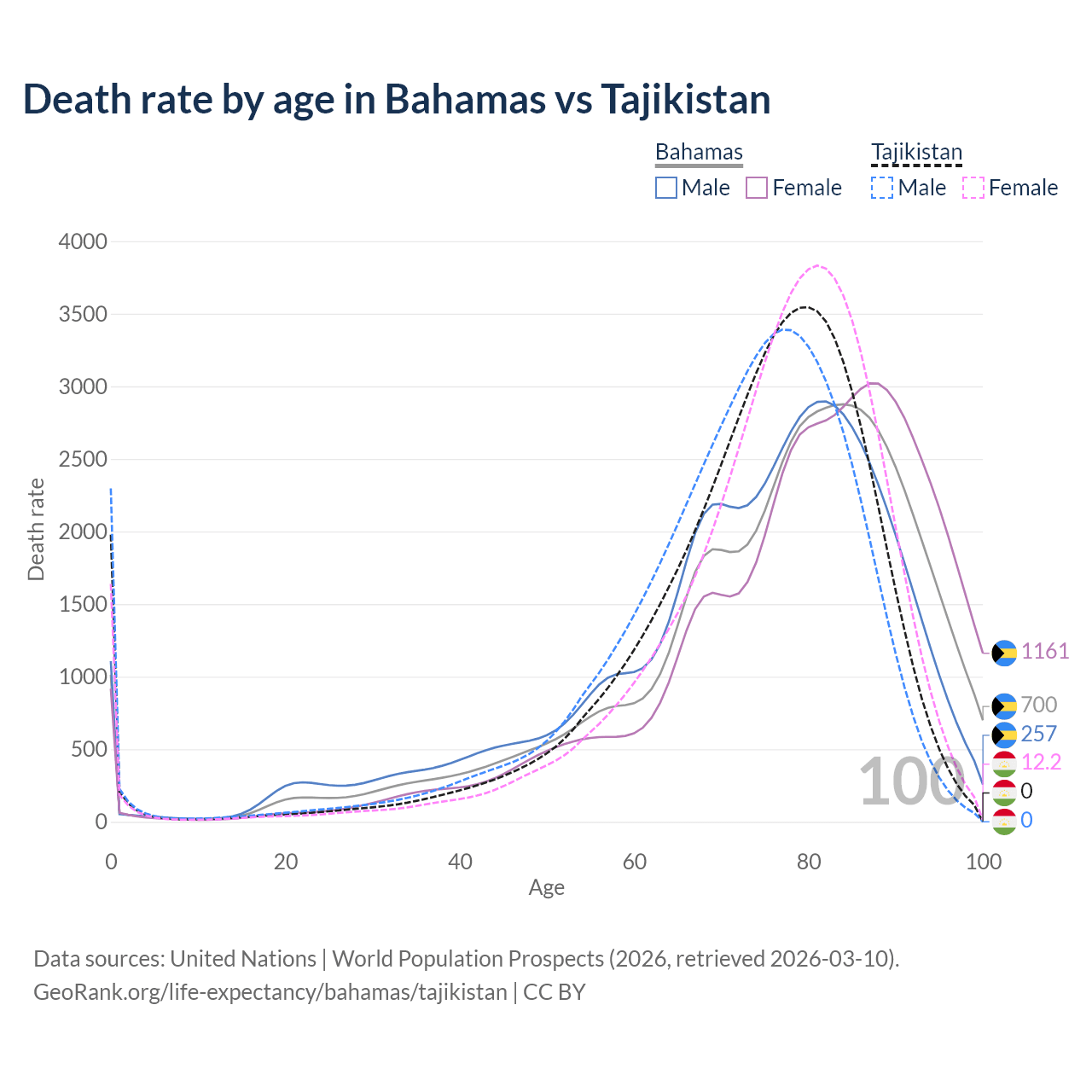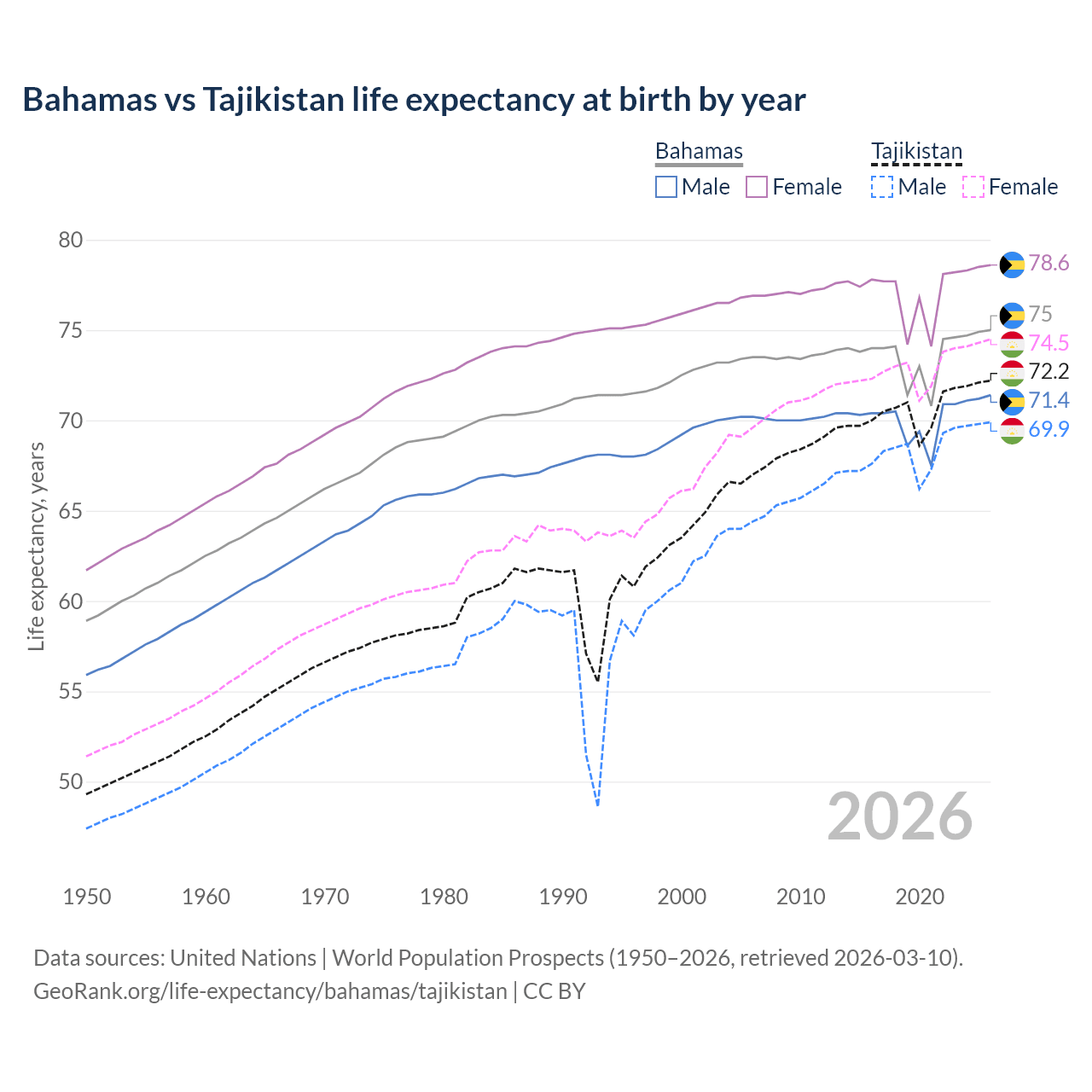 The average life expectancy at birth is 75 years in the Bahamas vs 72.2 in Tajikistan. The Bahamas is ranked 95/197 by life expectancy, and Tajikistan is 121/197. In the Bahamas, the life expectancy is 71.4 years for males and 78.6 years for females. In Tajikistan, it's 69.9 years for males and 74.5 years for females.