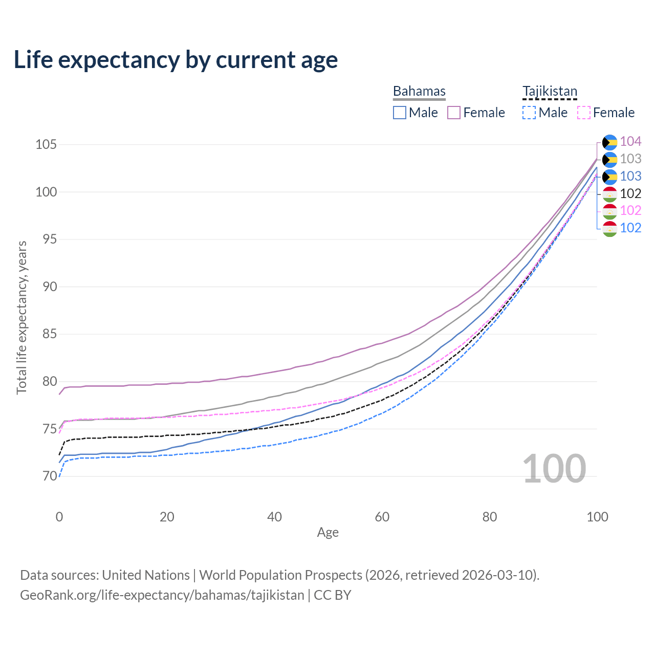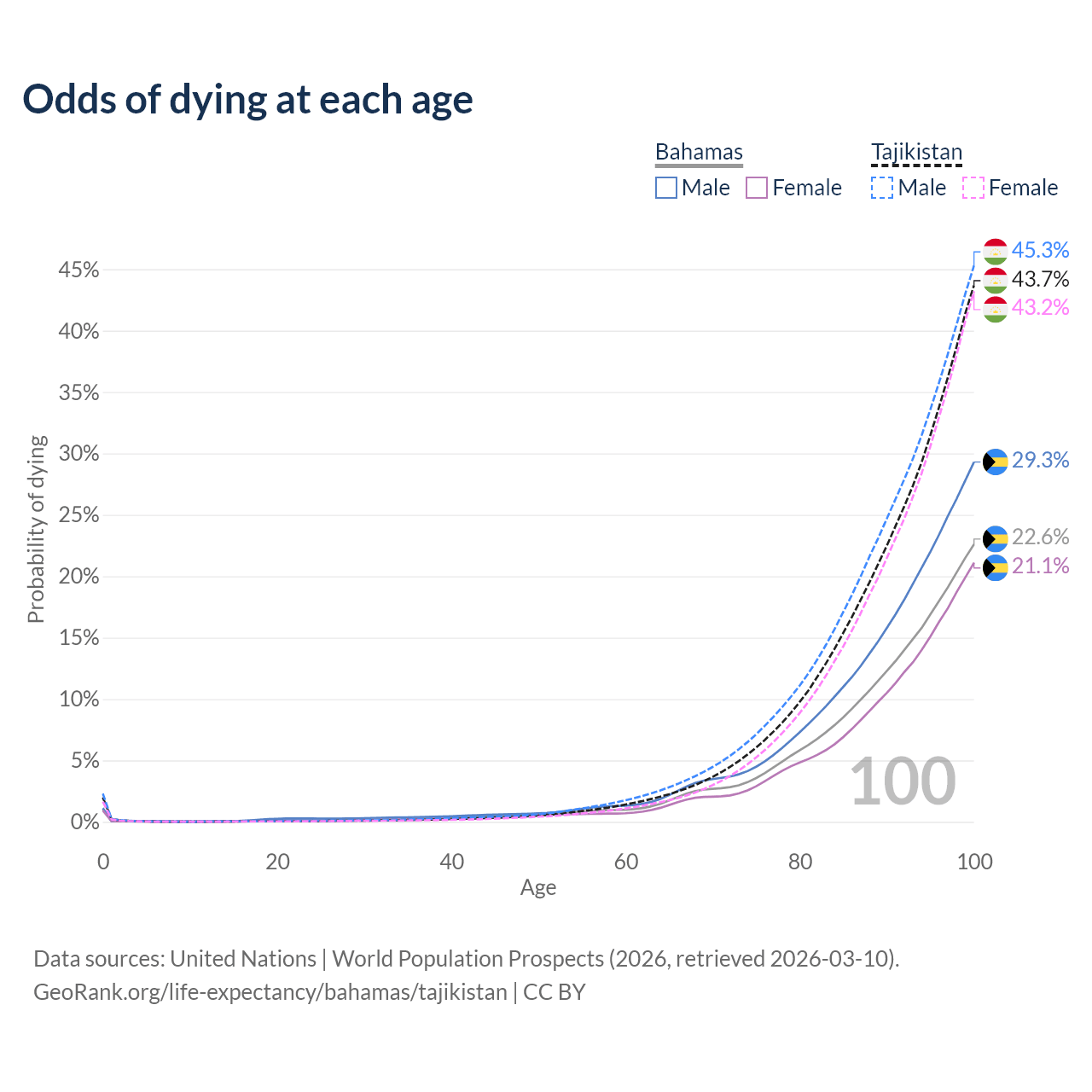 This life expectancy calculator shows the odds of living to 100, 95, 90, and below based on current age for both males and females in the Bahamas and Tajikistan, along with mean and median age of death. The calculations are based on the 2026 life tables (actuarial tables) from the UN World Population Prospects.