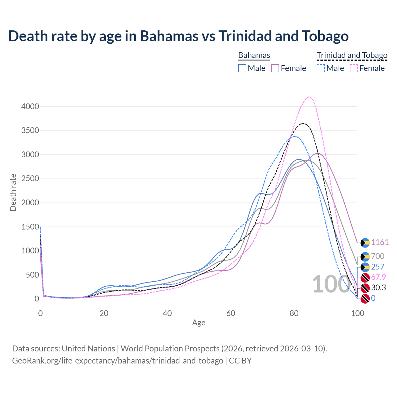 In the Bahamas, the most common age of death is 84, compared to 83 in Trinidad and Tobago. The median age of death is 79.2 in the Bahamas and 78.4 in Trinidad and Tobago, meaning only half of each cohort is expected to live past that age.