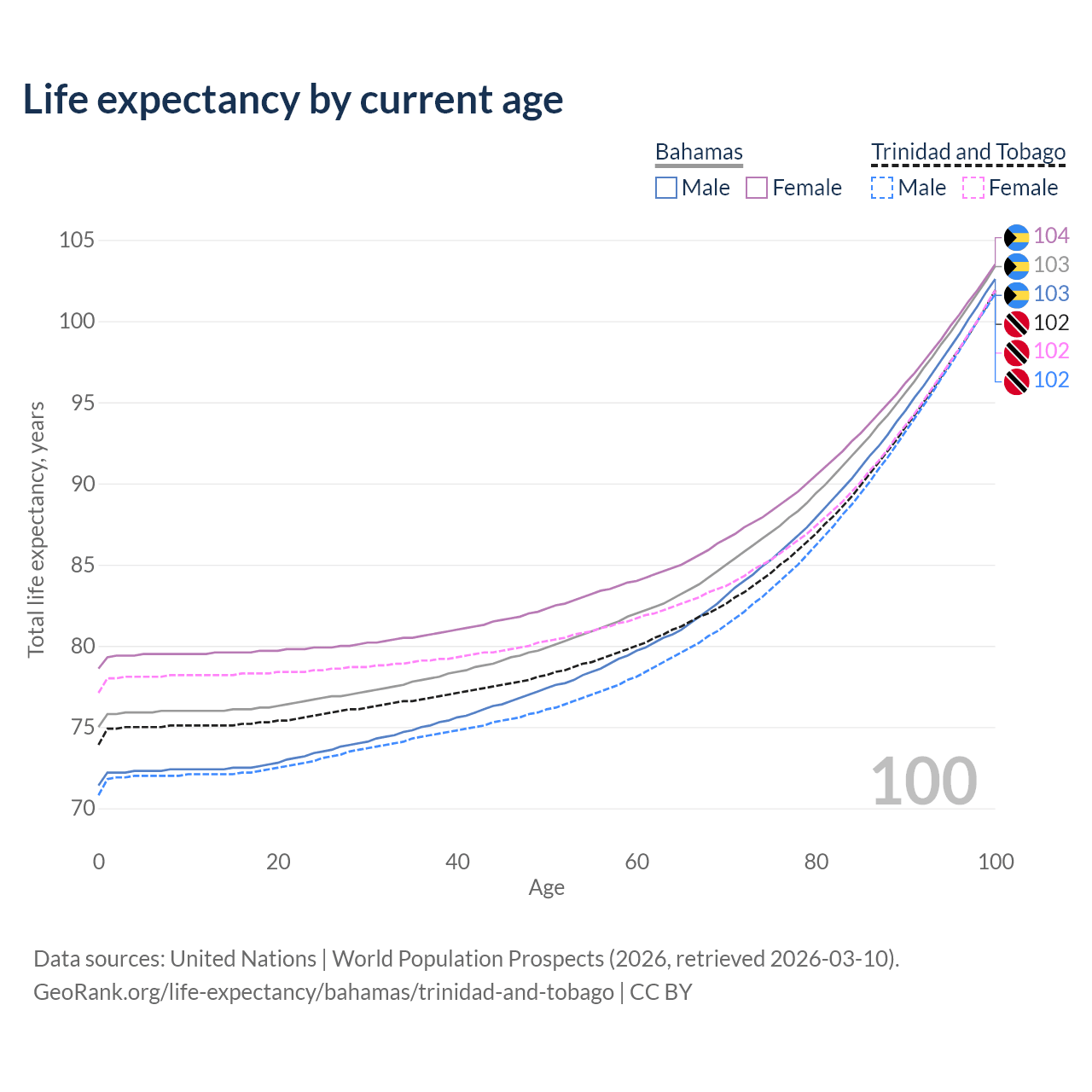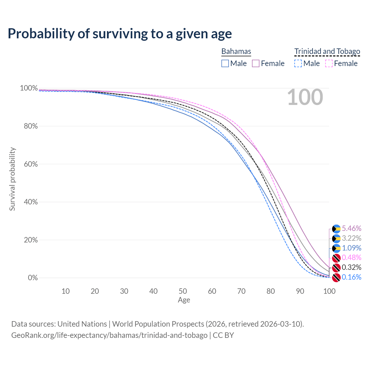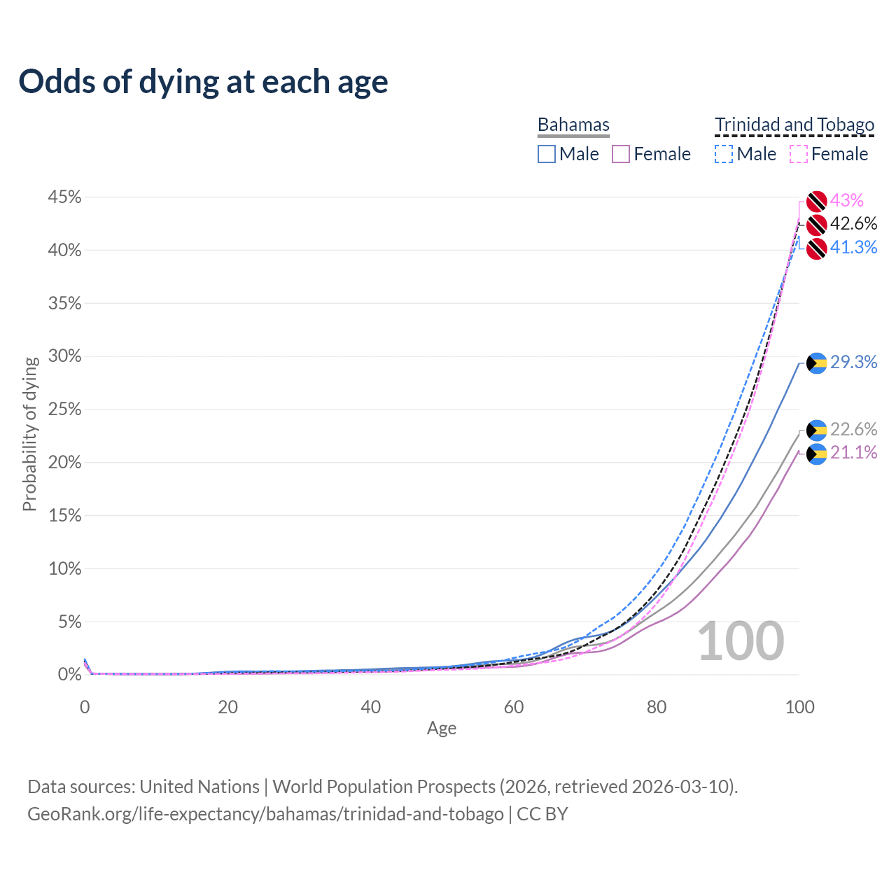 This life expectancy calculator shows the odds of living to 100, 95, 90, and below based on current age for both males and females in the Bahamas and Trinidad and Tobago, along with mean and median age of death. The calculations are based on the 2026 life tables (actuarial tables) from the UN World Population Prospects.