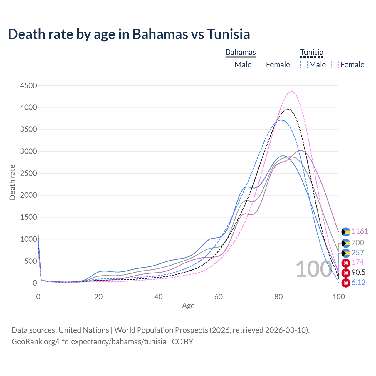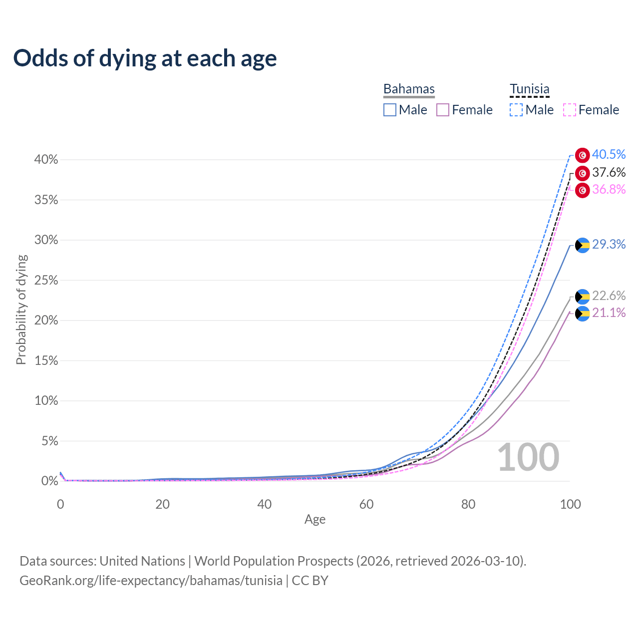This life expectancy calculator shows the odds of living to 100, 95, 90, and below based on current age for both males and females in the Bahamas and Tunisia, along with mean and median age of death. The calculations are based on the 2026 life tables (actuarial tables) from the UN World Population Prospects.