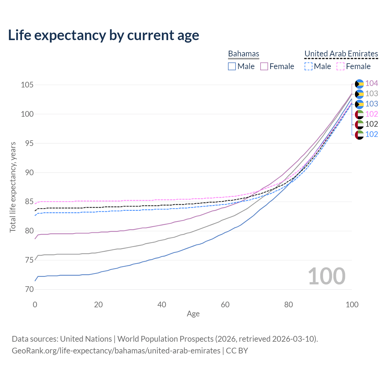 This life expectancy calculator shows the odds of living to 100, 95, 90, and below based on current age for both males and females in the Bahamas and the United Arab Emirates, along with mean and median age of death. The calculations are based on the 2026 life tables (actuarial tables) from the UN World Population Prospects.