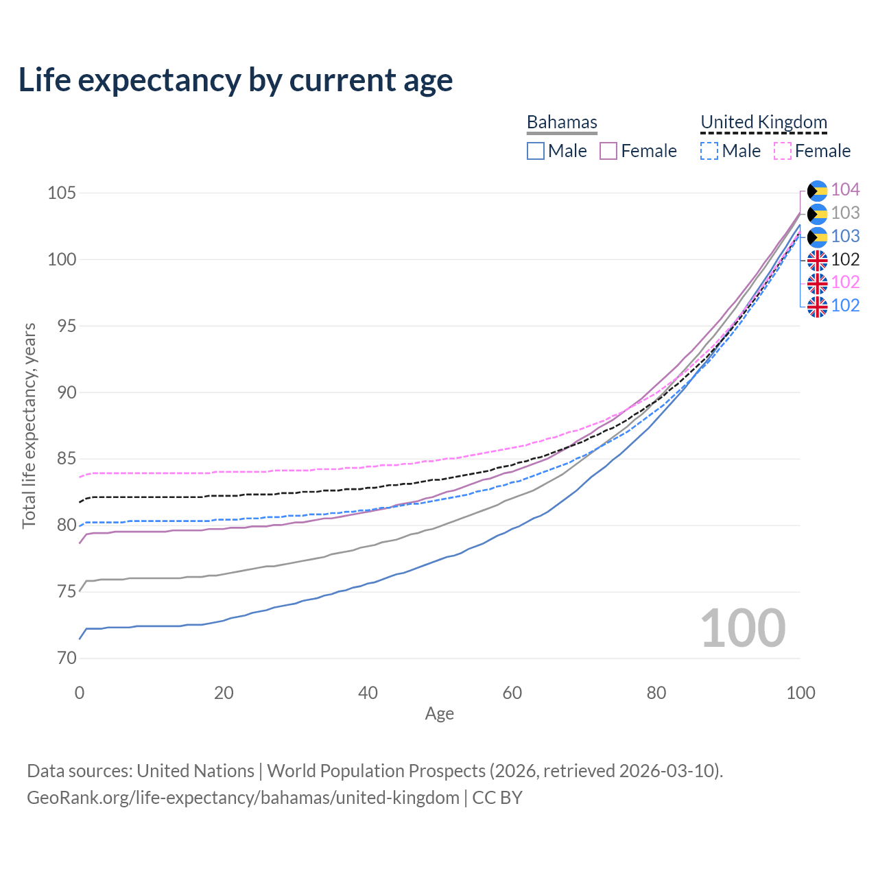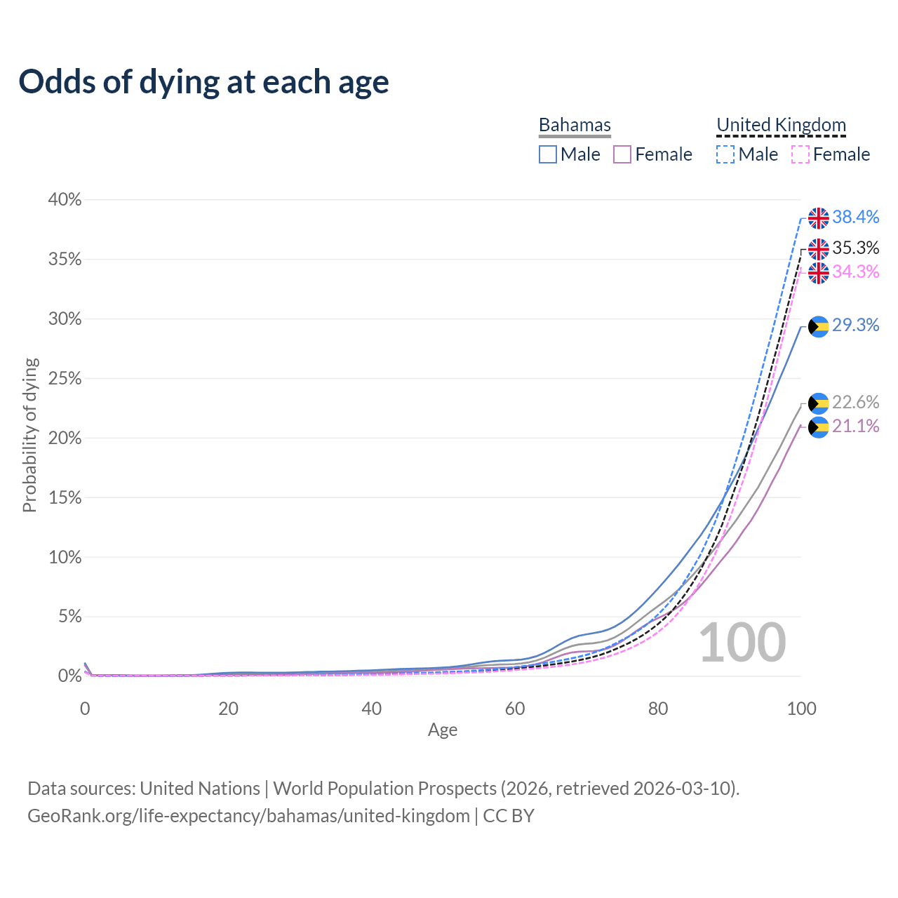 This life expectancy calculator shows the odds of living to 100, 95, 90, and below based on current age for both males and females in the Bahamas and the United Kingdom, along with mean and median age of death. The calculations are based on the 2026 life tables (actuarial tables) from the UN World Population Prospects.