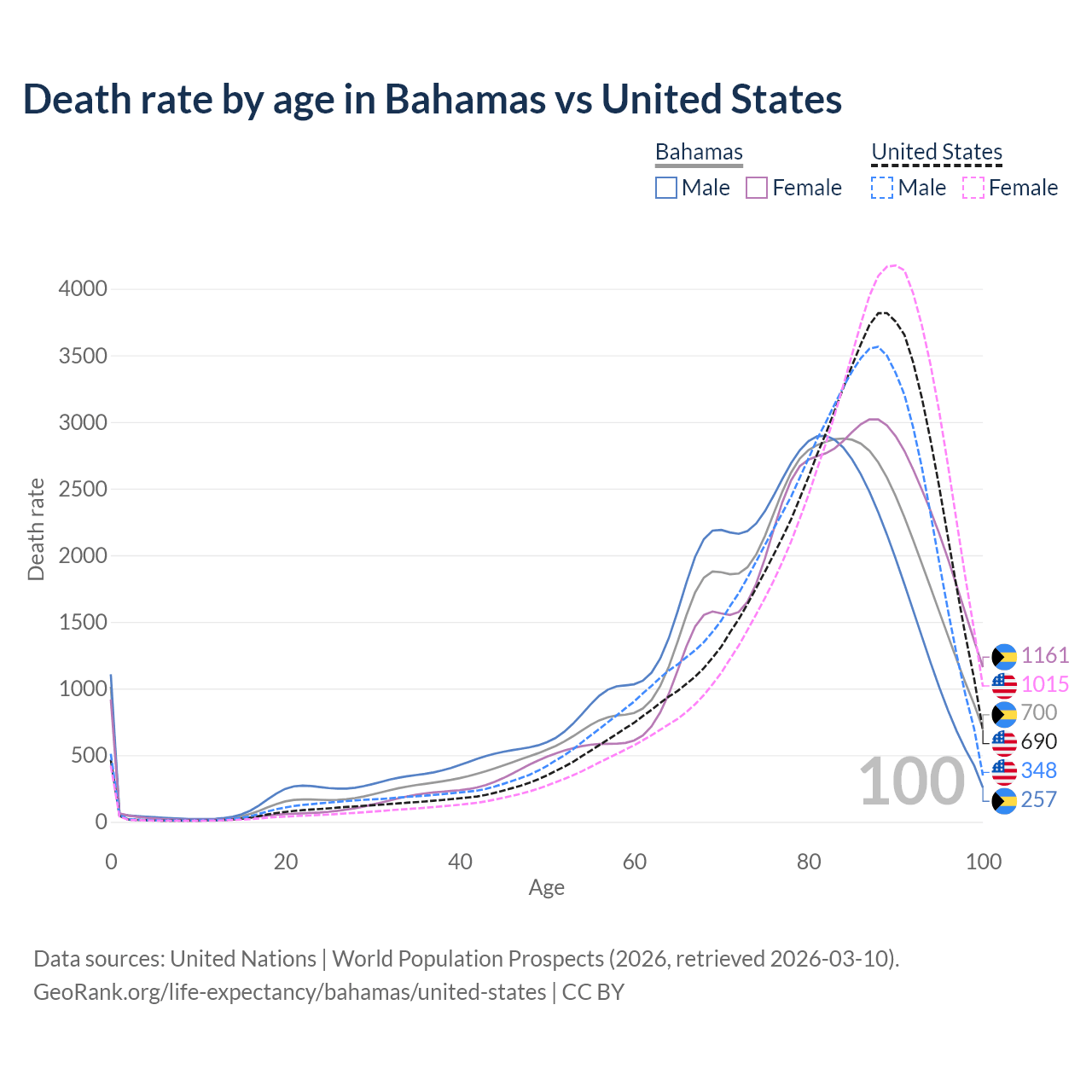 The average life expectancy at birth is 75 years in the Bahamas vs 79.8 in the United States. The Bahamas is ranked 95/197 by life expectancy, and the United States is 47/197. In the Bahamas, the life expectancy is 71.4 years for males and 78.6 years for females. In the United States, it's 77.4 years for males and 82.2 years for females.