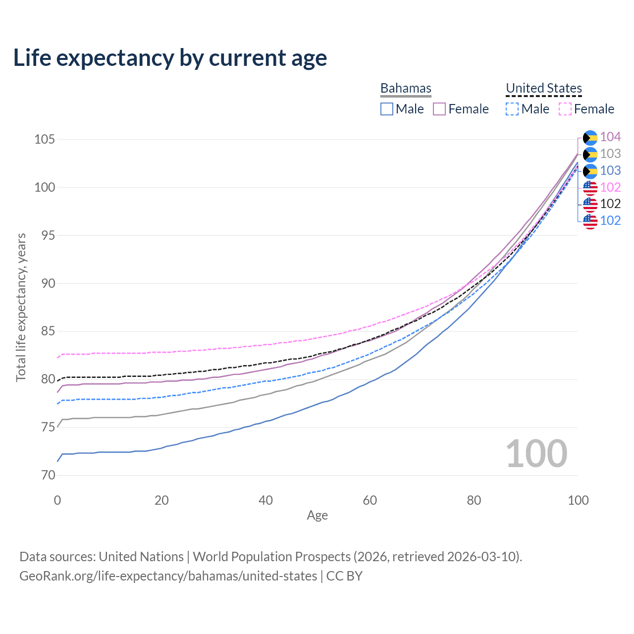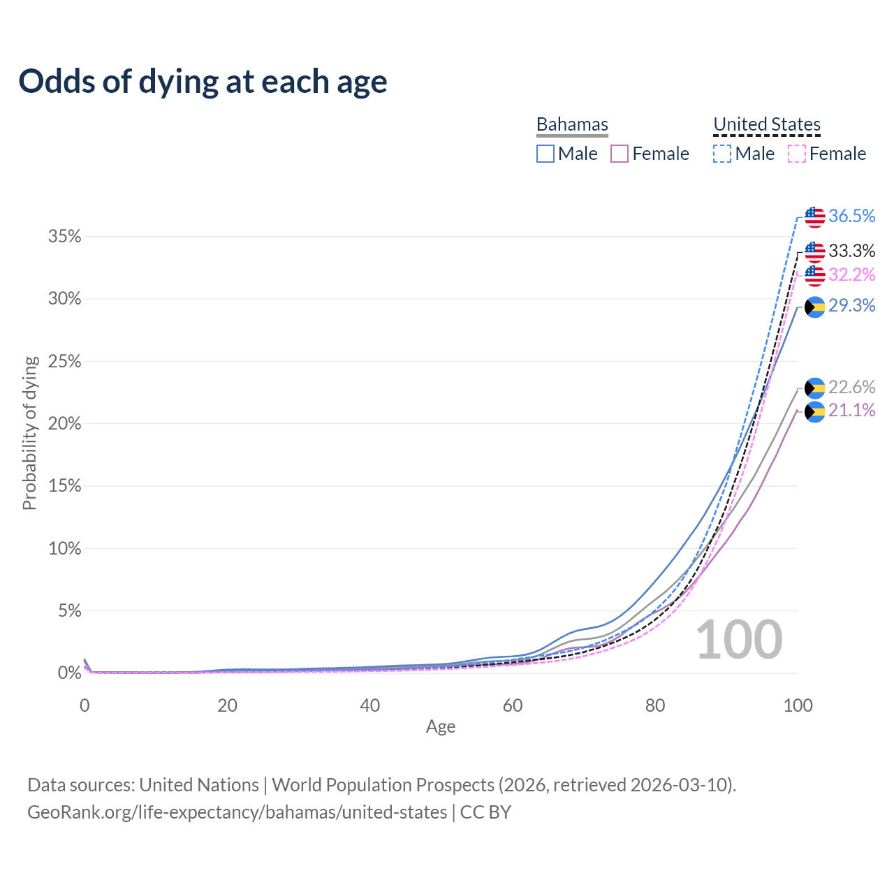 This life expectancy calculator shows the odds of living to 100, 95, 90, and below based on current age for both males and females in the Bahamas and the United States, along with mean and median age of death. The calculations are based on the 2026 life tables (actuarial tables) from the UN World Population Prospects.