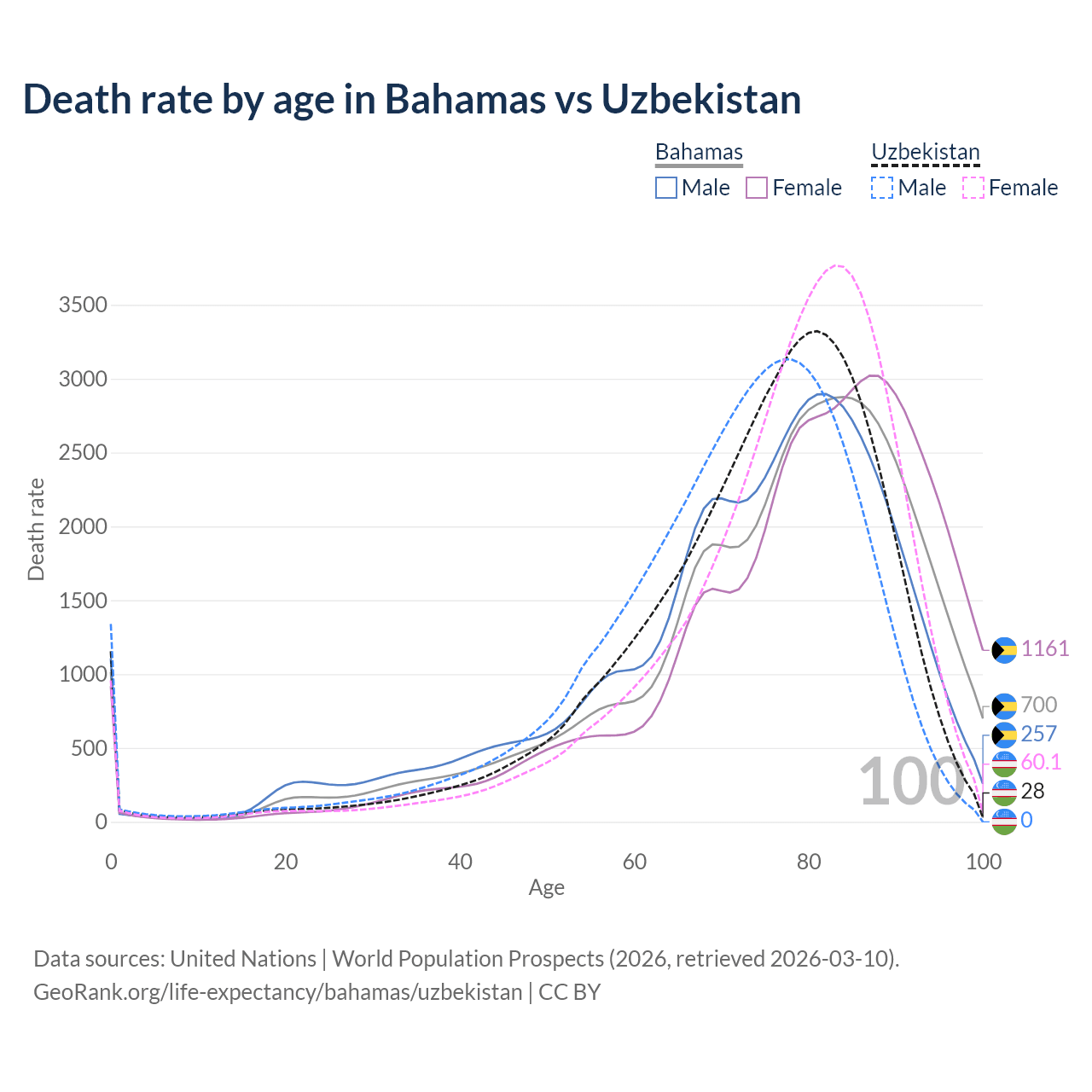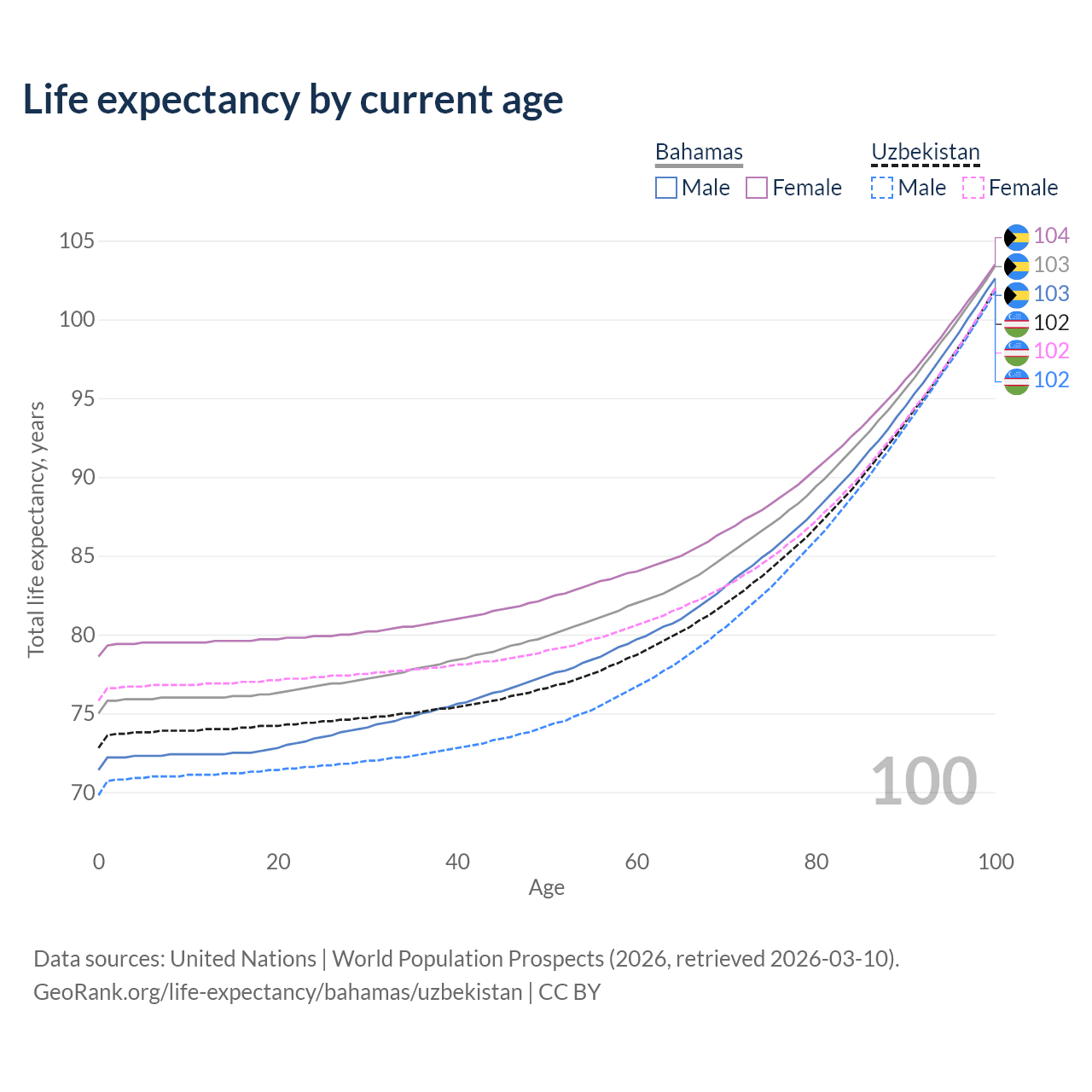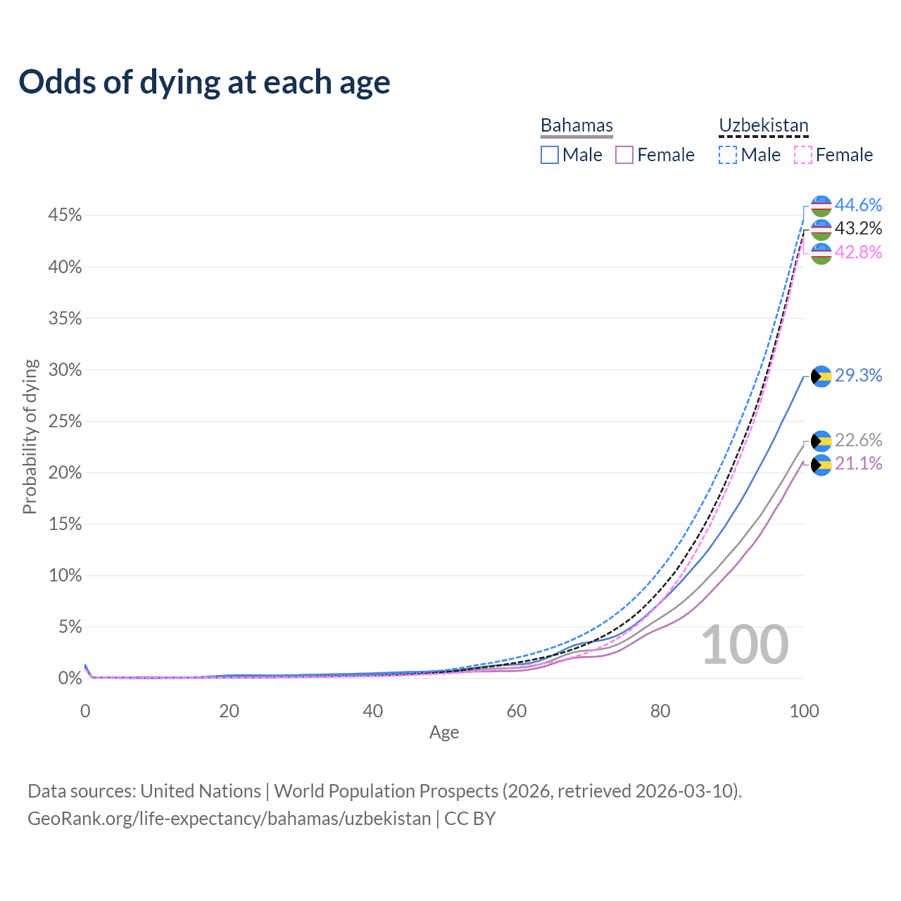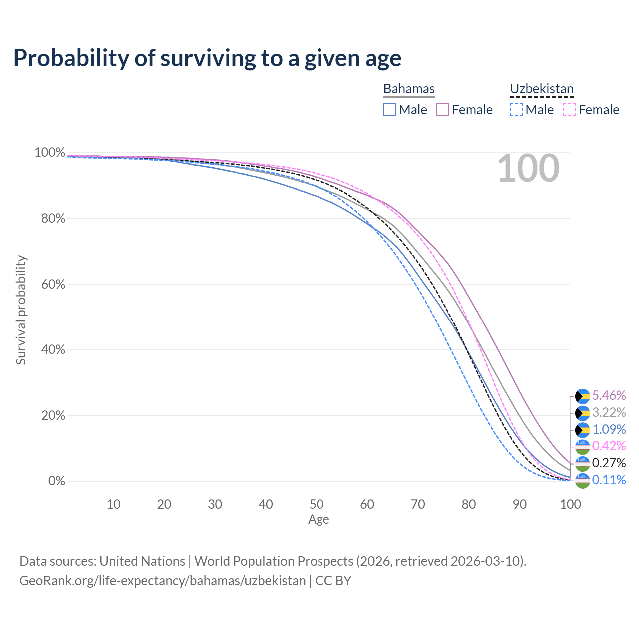 This life expectancy calculator shows the odds of living to 100, 95, 90, and below based on current age for both males and females in the Bahamas and Uzbekistan, along with mean and median age of death. The calculations are based on the 2026 life tables (actuarial tables) from the UN World Population Prospects.