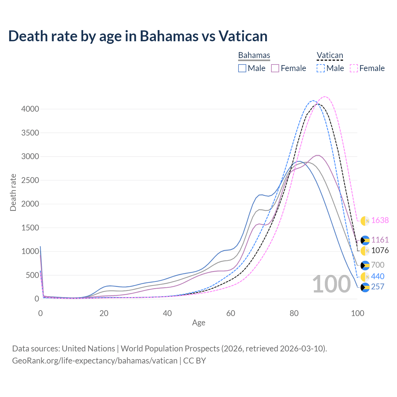 In the Bahamas, the most common age of death is 84, compared to 88 in the Vatican. The median age of death is 79.2 in the Bahamas and 85.7 in the Vatican, meaning only half of each cohort is expected to live past that age.