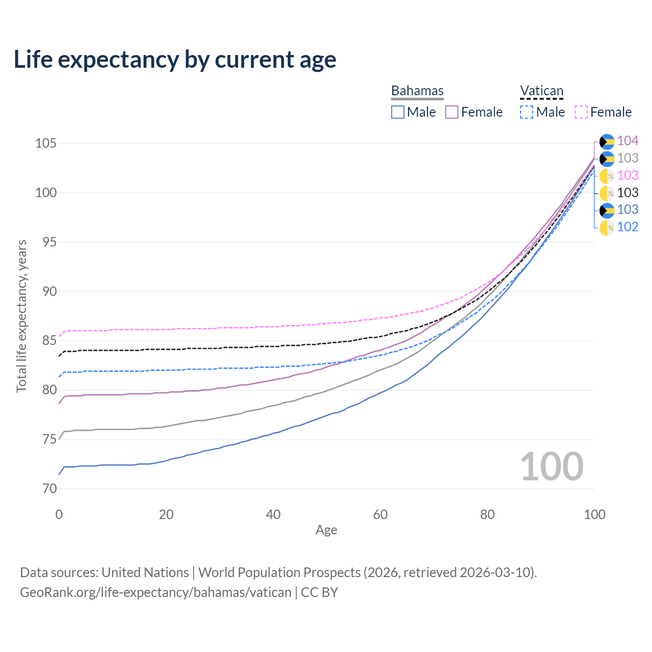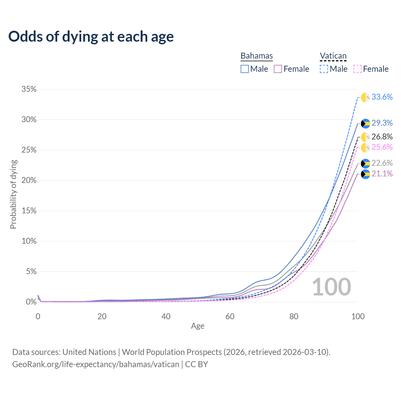 This life expectancy calculator shows the odds of living to 100, 95, 90, and below based on current age for both males and females in the Bahamas and the Vatican, along with mean and median age of death. The calculations are based on the 2026 life tables (actuarial tables) from the UN World Population Prospects.