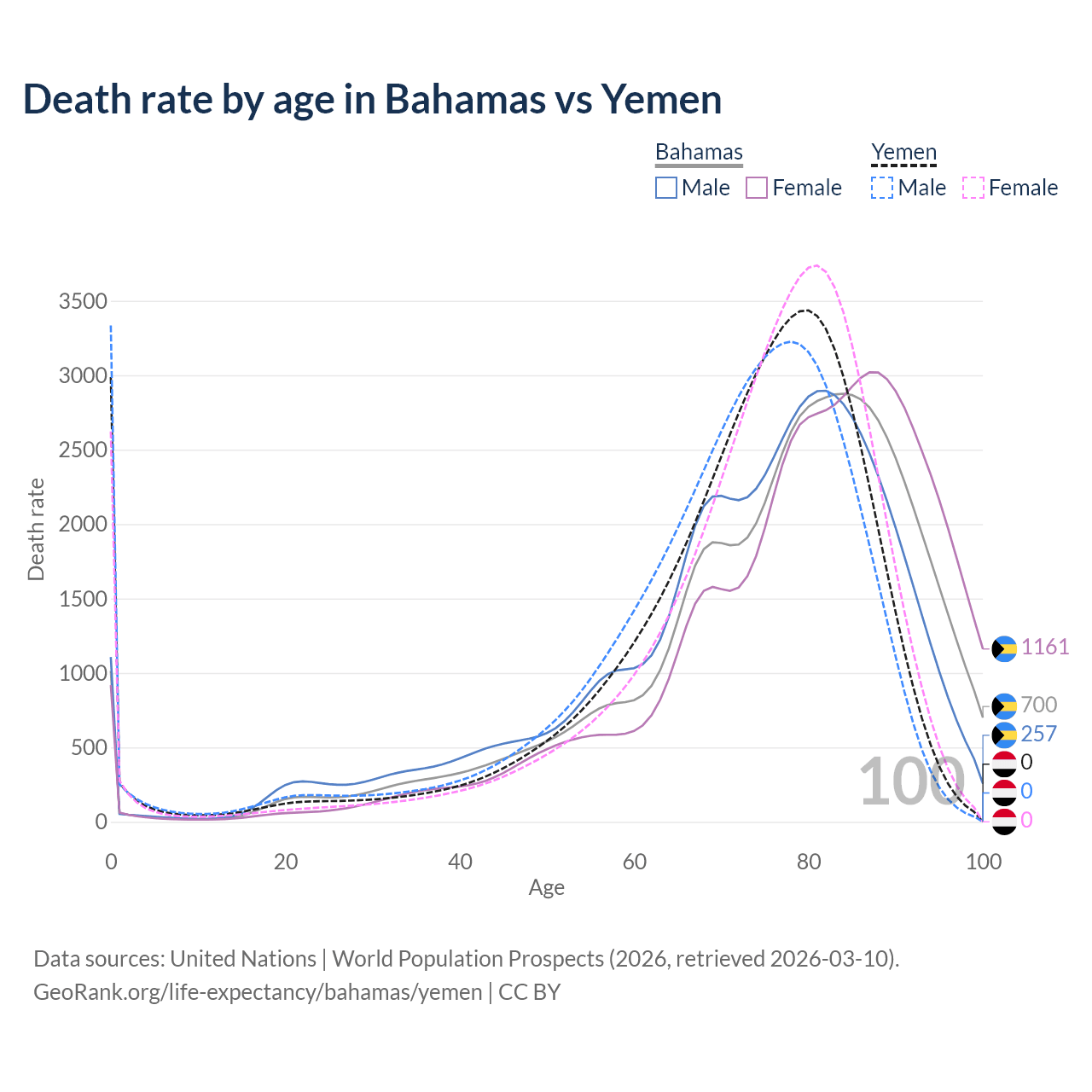 The average life expectancy at birth is 75 years in the Bahamas vs 69.7 in Yemen. The Bahamas is ranked 95/197 by life expectancy, and Yemen is 138/197. In the Bahamas, the life expectancy is 71.4 years for males and 78.6 years for females. In Yemen, it's 67.6 years for males and 71.9 years for females.